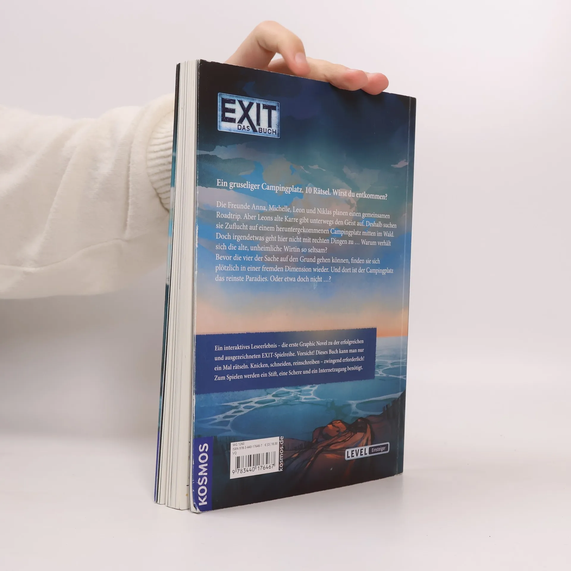 Die EXIT®-Bücher bieten eine einzigartige Kombination aus Rätselspaß und Lesevergnügen und sorgen für spannendes Live-Escape-Feeling für zu Hause. Löst knifflige Rätsel und versucht, so schnell wie möglich zu entkommen! Leon, Anna, Niklas und Michelle unternehmen gemeinsam eine Autotour. Als ihr Wagen Probleme macht, schaffen sie es gerade noch zu einem einsam gelegenen Campingplatz. Die Menschen, die Wohnwagen, die Landschaft – einfach alles hier ist mysteriös und schon bald wird der harmlose Ausflug zu einer unheimlichen Reise in eine andere Dimension. Hinweise können überall im Buch versteckt sein, kreative Lösungen sind gefragt. Ausschneiden, zeichnen, knicken – alles ist erlaubt. Live-Escape-Feeling für Einsteiger!