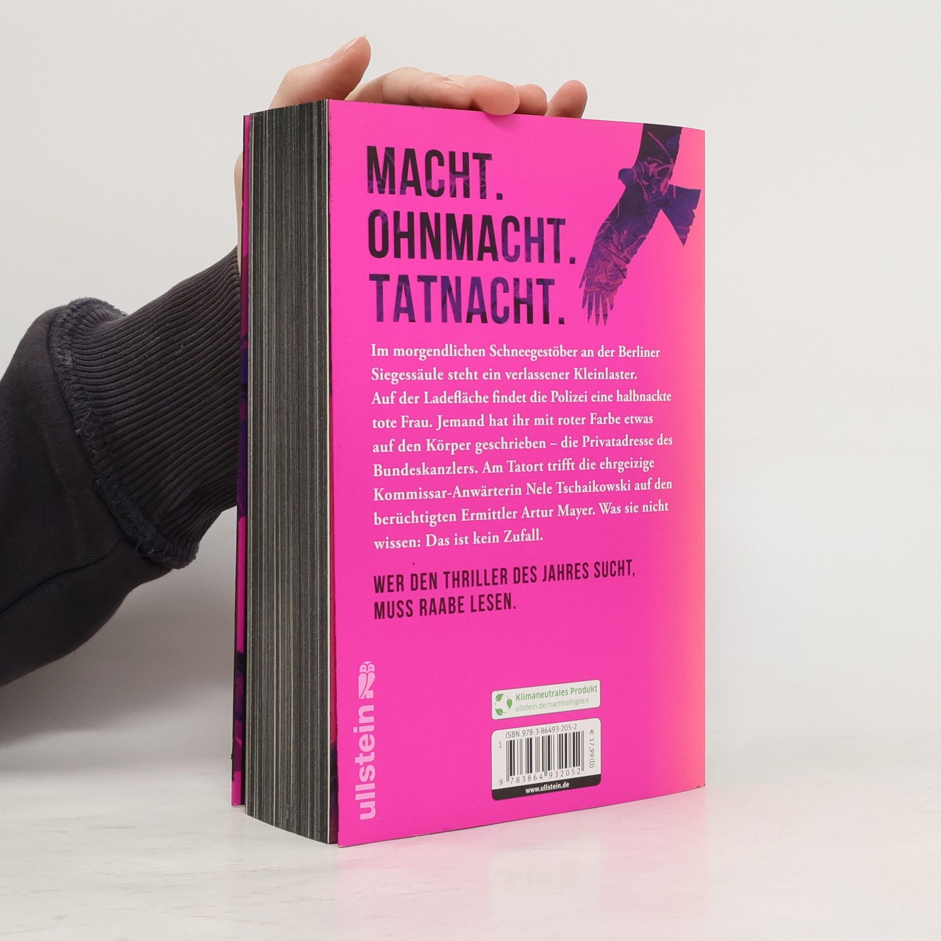Macht. Ohnmacht. Tatnacht. Im morgendlichen Schneegestöber an der Berliner Siegessäule steht ein verlassener Kleinlaster. Auf der Ladefläche findet die Polizei eine halbnackte tote Frau. Jemand hat ihr mit roter Farbe etwas auf den Körper geschrieben - die Privatadresse des Bundeskanzlers. Am Tatort trifft die ehrgeizige Kommissar-Anwärterin Nele Tschaikowski auf den berüchtigten Ermittler Artur Mayer. Was sie nicht wissen: Das ist kein Zufall. Das Thriller-Ereignis des Jahres mit farbigem Buchschnitt!