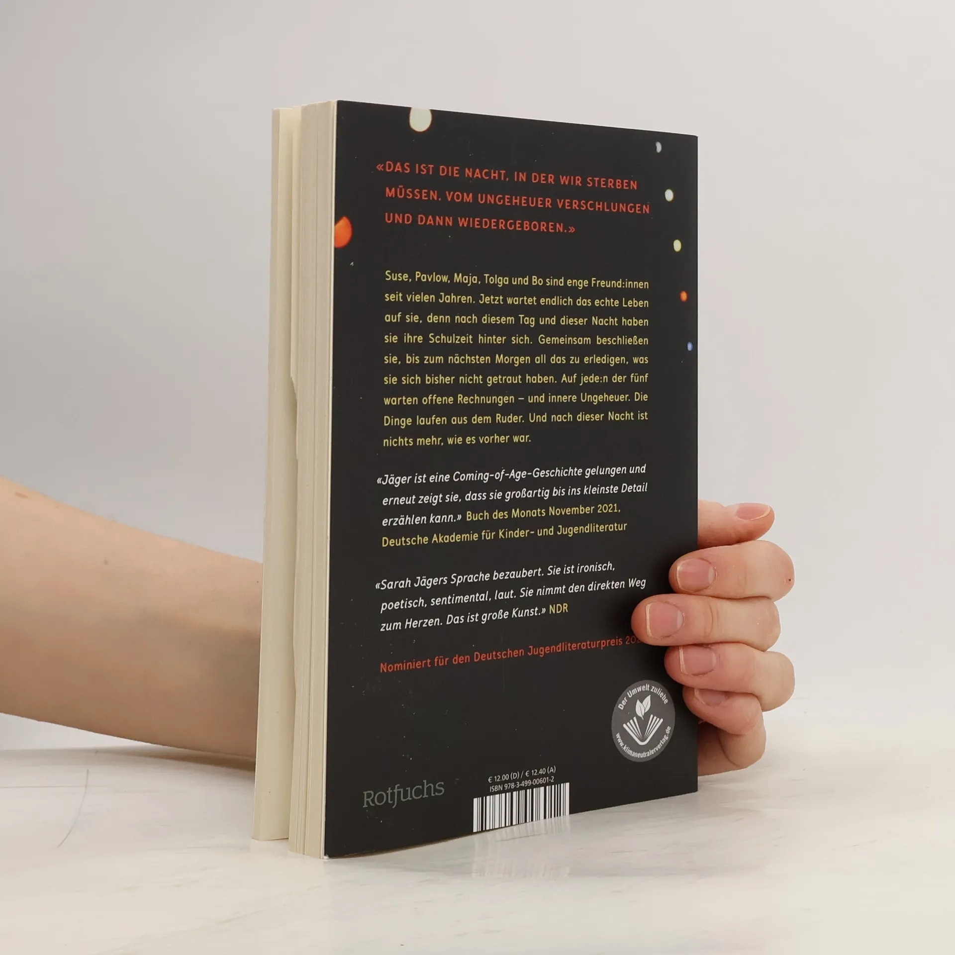 «Das ist die Nacht, in der wir sterben müssen. Vom Ungeheuer verschlungen und dann wiedergeboren.» Suse, Pavlow, Maja, Tolga und Bo sind enge Freund: innen seit vielen Jahren. Jetzt wartet endlich das echte Leben auf sie, denn nach diesem Tag und dieser Nacht haben sie ihre Schulzeit hinter sich. Gemeinsam beschließen sie, bis zum nächsten Morgen all das zu erledigen, was sie sich bisher nicht getraut haben. Auf jede: n der fünf warten offene Rechnungen – und innere Ungeheuer. Die Dinge laufen aus dem Ruder. Und nach dieser Nacht ist nichts mehr, wie es vorher war. «Sarah Jägers Debüt ist komisch, poetisch, aber vor allem eine kluge und vielschichtige Milieustudie.» DIE ZEIT über «Nach vorn, nach Süden»