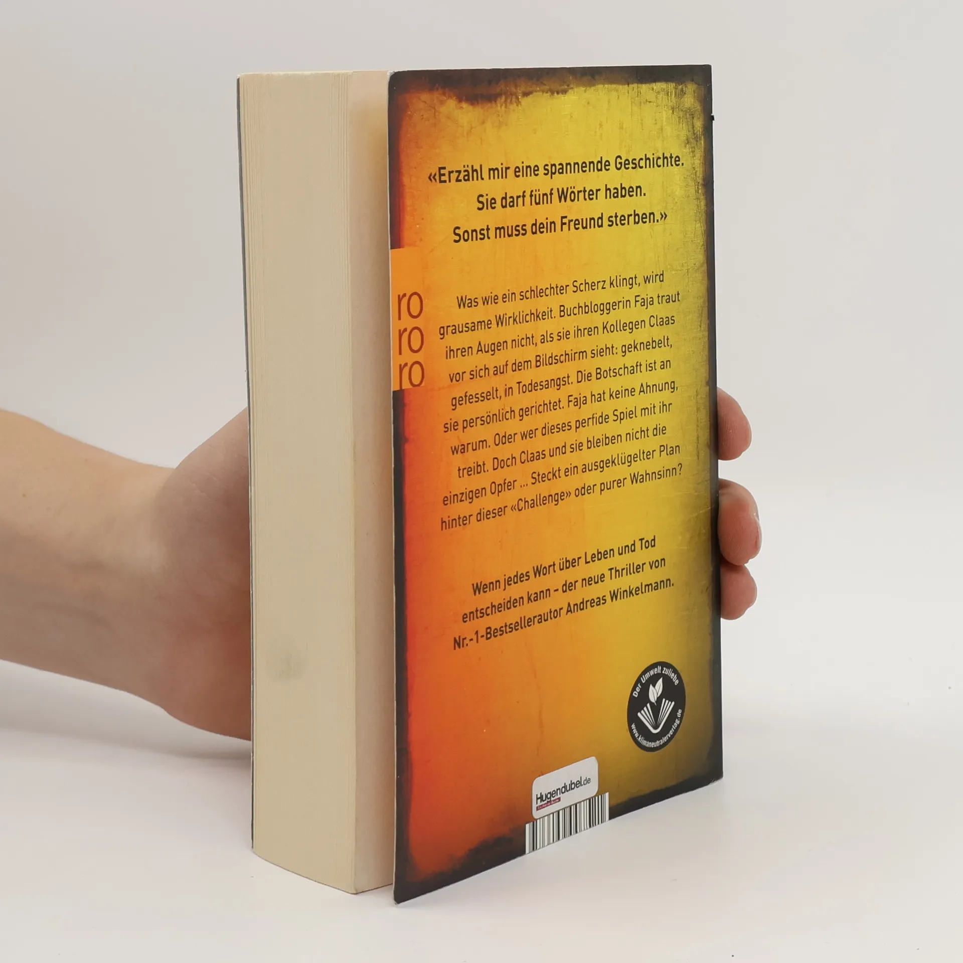 Wenn jedes Wort über Leben und Tod entscheiden kann - der neue Thriller von Nr.-1-Bestsellerautor Andreas Winkelmann.  «Erzähl mir eine spannende Geschichte. Sie darf fünf Wörter haben. Sonst muss dein Freund sterben.» Was wie ein schlechter Scherz klingt, wird grausame Wirklichkeit. Buchbloggerin Faja traut ihren Augen nicht, als sie ihren Kollegen Claas vor sich auf dem Bildschirm sieht: geknebelt, gefesselt, in Todesangst. Die Botschaft ist an sie persönlich gerichtet. Faja hat keine Ahnung, warum. Oder wer dieses perfide Spiel mit ihr treibt. Doch Claas und sie bleiben nicht die einzigen Opfer …  Steckt ein ausgeklügelter Plan hinter der «Challenge» oder purer Wahnsinn?