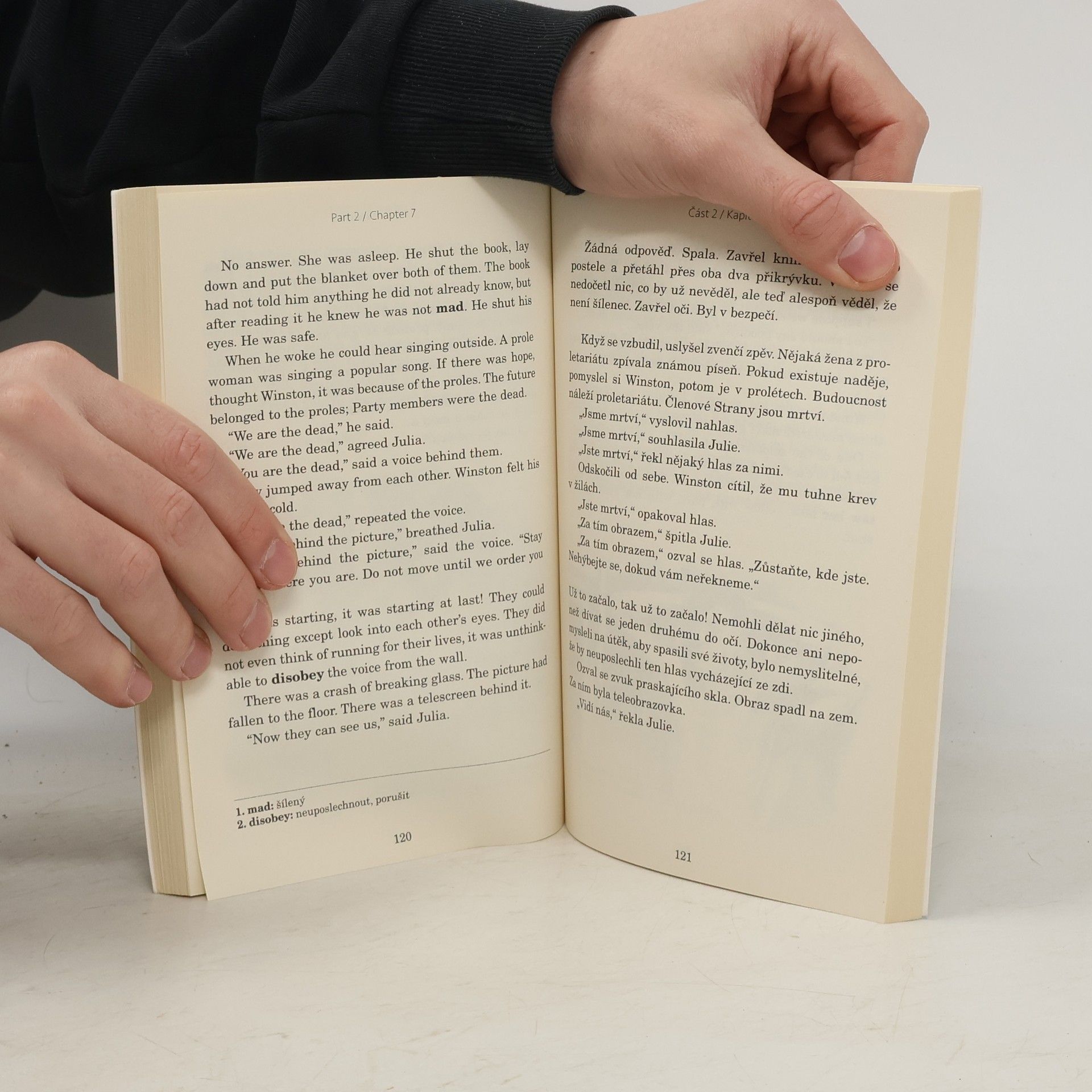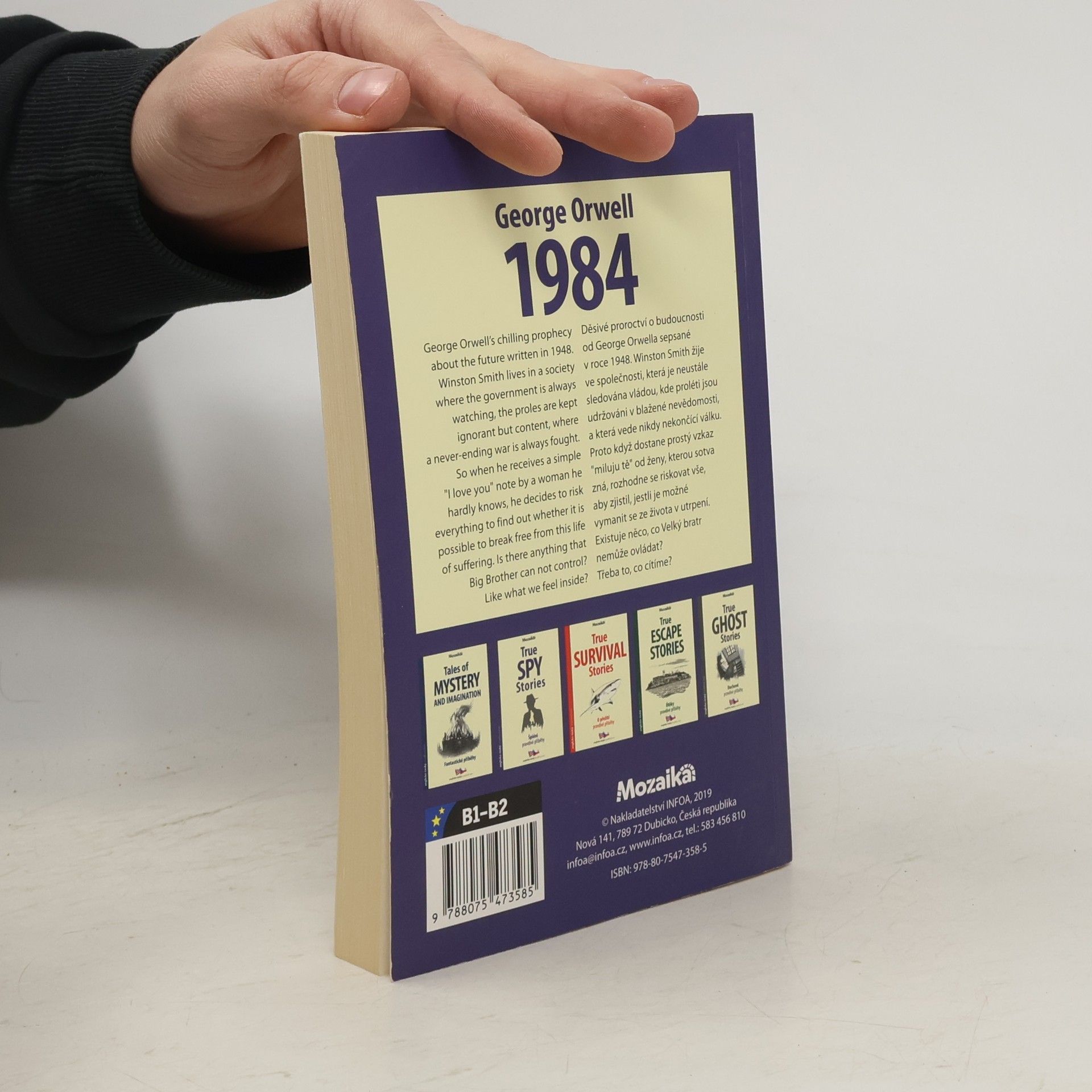 Adaptace díla George Orwella. Anglicko-český zrcadlový text (B1–B2). Děsivé proroctví o budoucnosti od George Orwella sepsané v roce 1984. Winston Smith žije ve společnosti, která je neustále sledována vládou, kde proléti jsou udržováni v blažené nevědomosti, a která vede nikdy nekončící válku. Proto když dostane prostý vzkaz miluju tě od ženy, kterou sotva zná, rozhodne se riskovat vše, aby zjistil, jestli je možné vymanit se ze života v utrpení. Existuje něco, co Velký bratr nemůže ovládat? Třeba to, co cítíme.