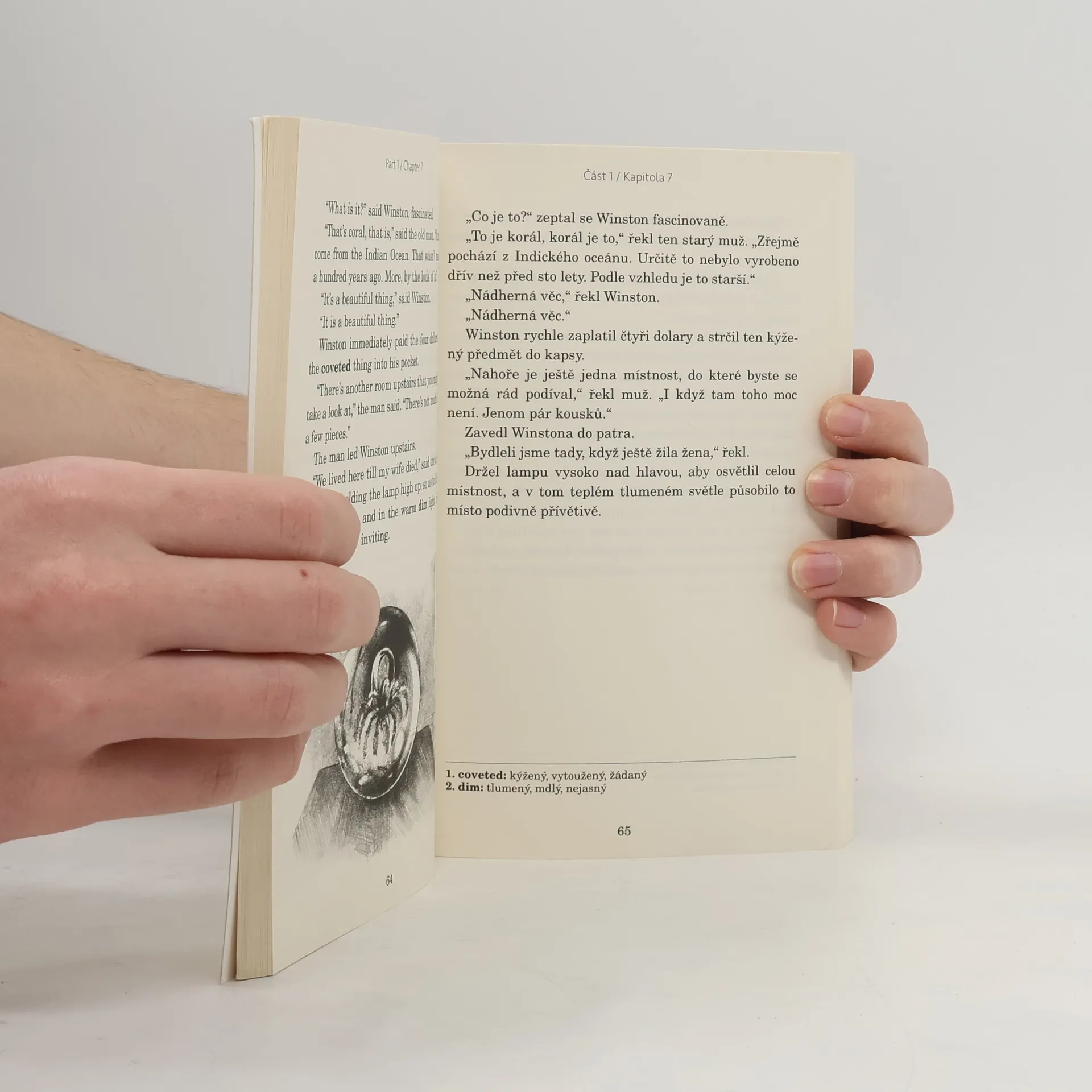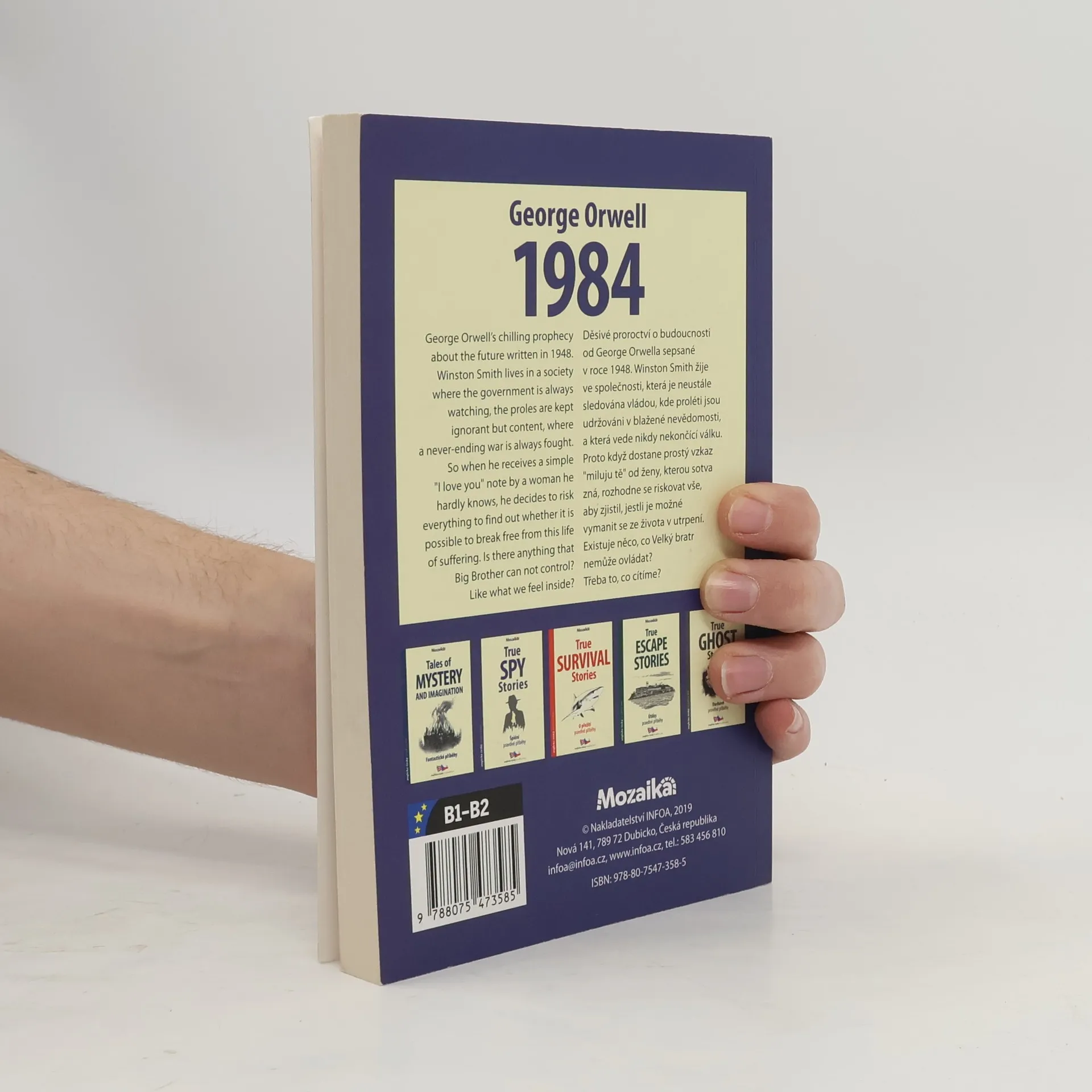 Adaptace díla George Orwella. Anglicko-český zrcadlový text (B1–B2). Děsivé proroctví o budoucnosti od George Orwella sepsané v roce 1984. Winston Smith žije ve společnosti, která je neustále sledována vládou, kde proléti jsou udržováni v blažené nevědomosti, a která vede nikdy nekončící válku. Proto když dostane prostý vzkaz miluju tě od ženy, kterou sotva zná, rozhodne se riskovat vše, aby zjistil, jestli je možné vymanit se ze života v utrpení. Existuje něco, co Velký bratr nemůže ovládat? Třeba to, co cítíme.