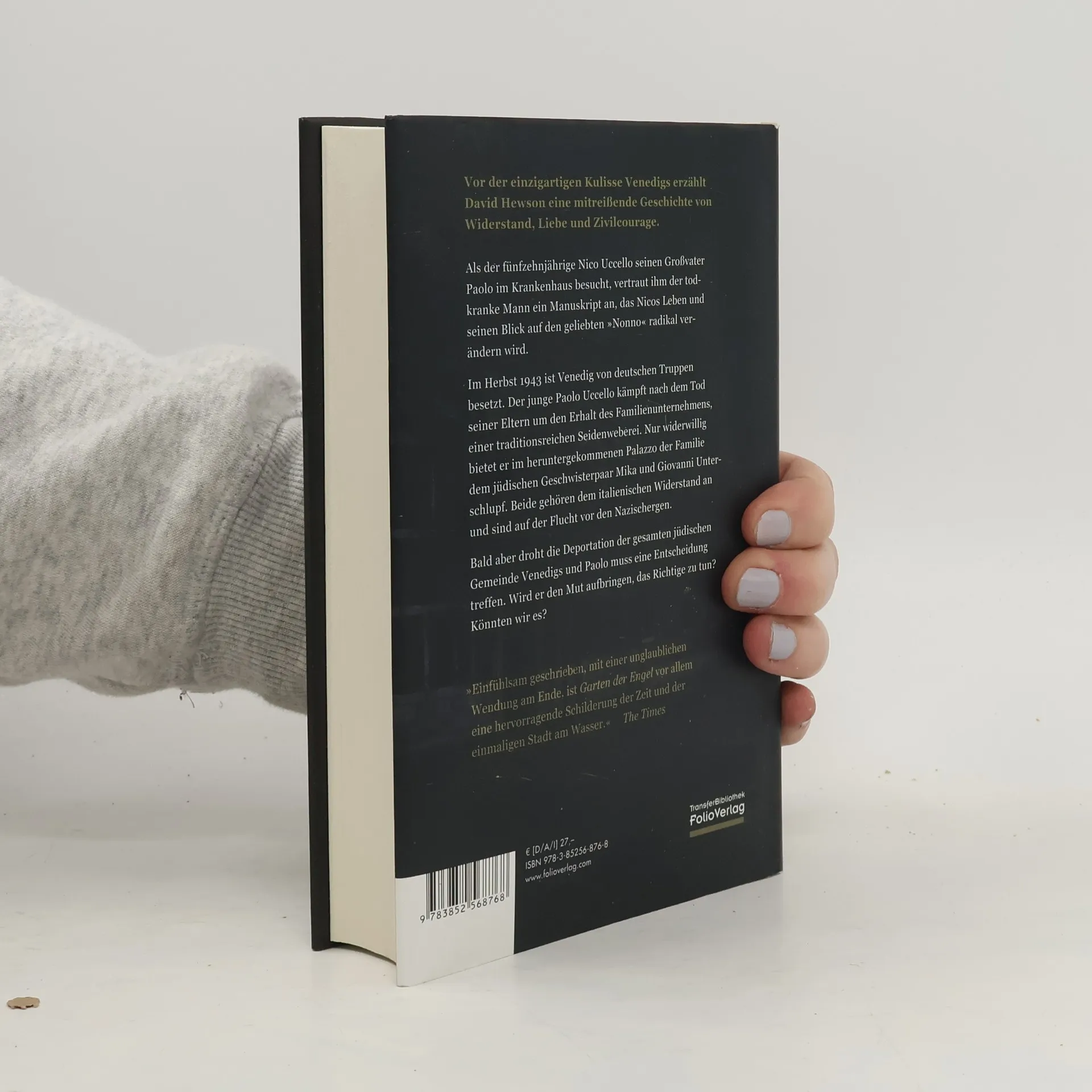 Vor der einzigartigen Kulisse Venedigs erzählt David Hewson eine mitreißende Geschichte von Widerstand, Liebe und Zivilcourage. Als der fünfzehnjährige Nico Uccello seinen Großvater Paolo im Krankenhaus besucht, vertraut ihm der todkranke Mann ein Manuskript an, das Nicos Leben und seinen Blick auf den geliebten „Nonno“ radikal verändern wird. Im Herbst 1943 ist Venedig von deutschen Truppen besetzt. Der junge Paolo Uccello kämpft nach dem Tod seiner Eltern um den Erhalt des Familienunternehmens, einer traditionsreichen Seidenweberei. Nur widerwillig bietet er im heruntergekommenen Palazzo der Familie dem jüdischen Geschwisterpaar Mika und Giovanni Unterschlupf. Beide gehören dem italienischen Widerstand an und sind auf der Flucht vor den Nazischergen. Bald aber droht die Deportation der gesamten jüdischen Gemeinde Venedigs und Paolo muss eine Entscheidung treffen. Wird er den Mut aufbringen, das Richtige zu tun? Könnten wir es? Vom Autor der Bücher zur TV-Serie „Kommissarin Lund – Das Verbrechen“. „Eine der Fragen, die ich beantworten wollte, war: Was bringt einen ganz normalen, nicht besonders heldenhaften Bürger dazu, sein Leben und das seiner Familie zu riskieren, um sich dem Terror entgegenzustellen? Woher kommt dieser Mut?“ (David Hewson)
