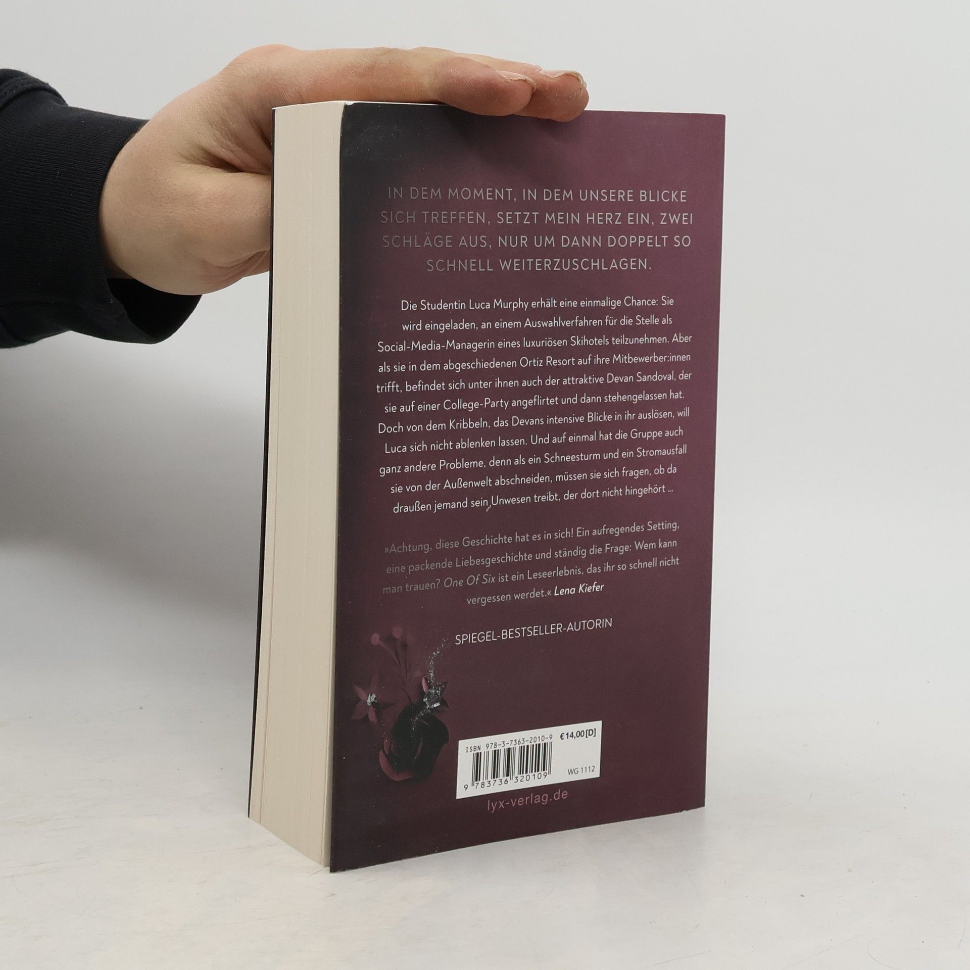 In dem Moment, in dem unsere Blicke sich treffen, setzt mein Herz ein, zwei Schläge aus, nur um dann doppelt so schnell weiterzuschlagen. Die Studentin Luca Murphy erhält eine einmalige Chance: Sie wird eingeladen, an einem Auswahlverfahren für die Stelle als Social-Media-Managerin eines luxuriösen Skihotels teilzunehmen. Aber als sie in dem abgeschiedenen Ortiz Resort auf ihre Mitbewerber: innen trifft, befindet sich unter ihnen auch der attraktive Devan Sandoval, der sie auf einer College-Party angeflirtet und dann stehengelassen hat. Doch von dem Kribbeln, das Devans intensive Blicke in ihr auslösen, will Luca sich nicht ablenken lassen. Und auf einmal hat die Gruppe auch ganz andere Probleme, denn als ein Schneesturm und ein Stromausfall sie von der Außenwelt abschneiden, müssen sie sich fragen, ob da draußen jemand sein Unwesen treibt, der dort nicht hingehört ... »Achtung, diese Geschichte hat es in sich! Ein aufregendes Setting, eine packende Liebesgeschichte und ständig die Frage: Wem kann man trauen? ONE OF SIX ist ein Leseerlebnis, das ihr so schnell nicht vergessen werdet.« LENA KIEFER Erster Band der ONE OF SIX Reihe von SPIEGEL -Bestseller-Autorin Kim Nina Ocker