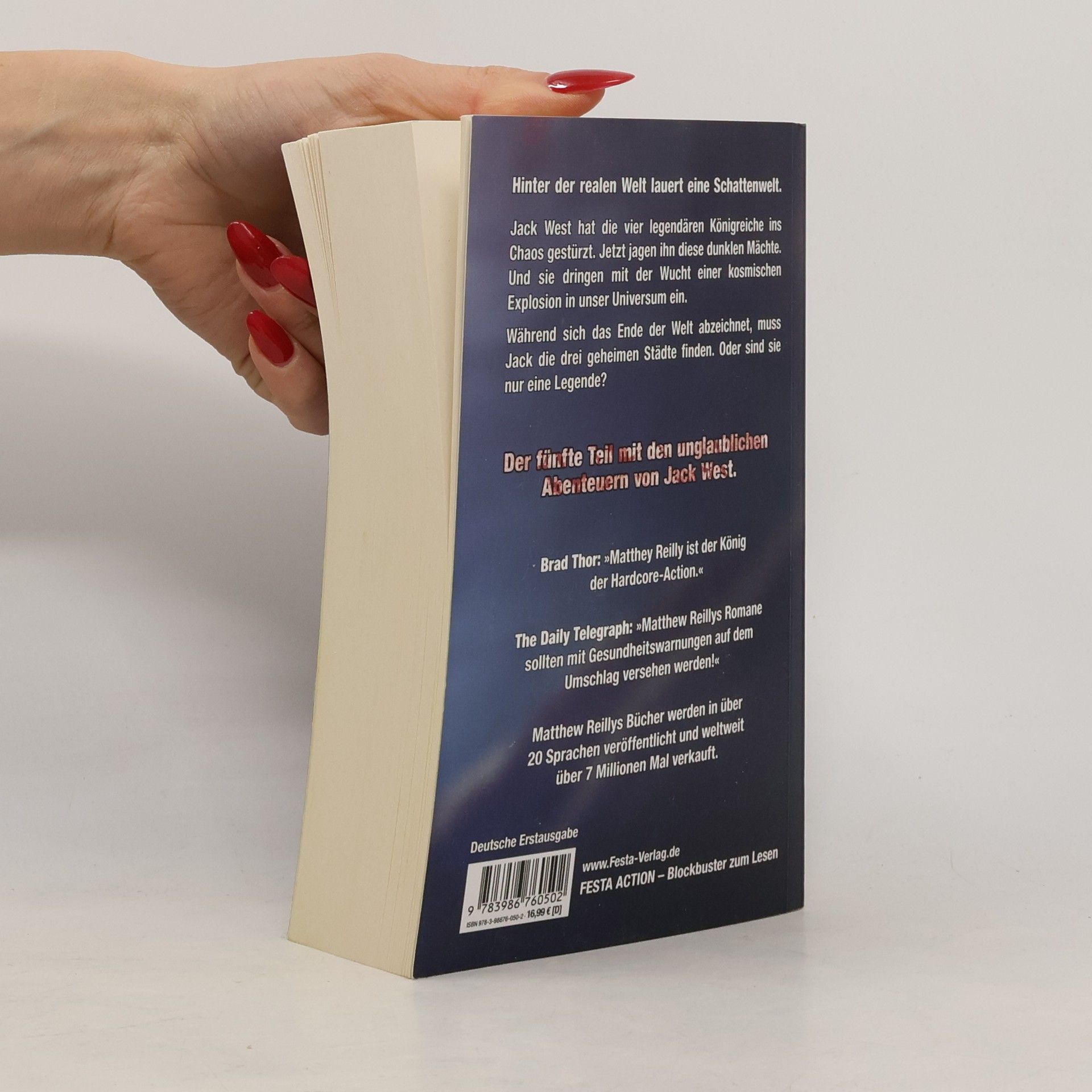 Hinter der realen Welt lauert eine Schattenwelt. Jack West hat die vier legendären Königreiche ins Chaos gestürzt. Jetzt jagen ihn diese dunklen Mächte. Und sie dringen mit der Wucht einer kosmischen Explosion in unser Universum ein. Während sich das Ende der Welt abzeichnet, muss Jack die drei geheimen Städte finden. Oder sind sie nur eine Legende? Der fünfte Teil mit den unglaublichen Abenteuern von Jack West. Booklist : »Reilly überholt, übertrumpft und überbietet Meister des Abenteuerromans wie Dan Brown, Steve Berry, James Rollins und Clive Cussler.« The Daily Telegraph: »Matthew Reillys Romane sollten mit Gesundheitswarnungen auf dem Umschlag versehen werden!« Brad Thor: »Matthey Reilly ist der König der Hardcore-Action.« Matthew Reillys Bücher werden in über 20 Sprachen veröffentlicht und weltweit über 7 Millionen Mal verkauft.