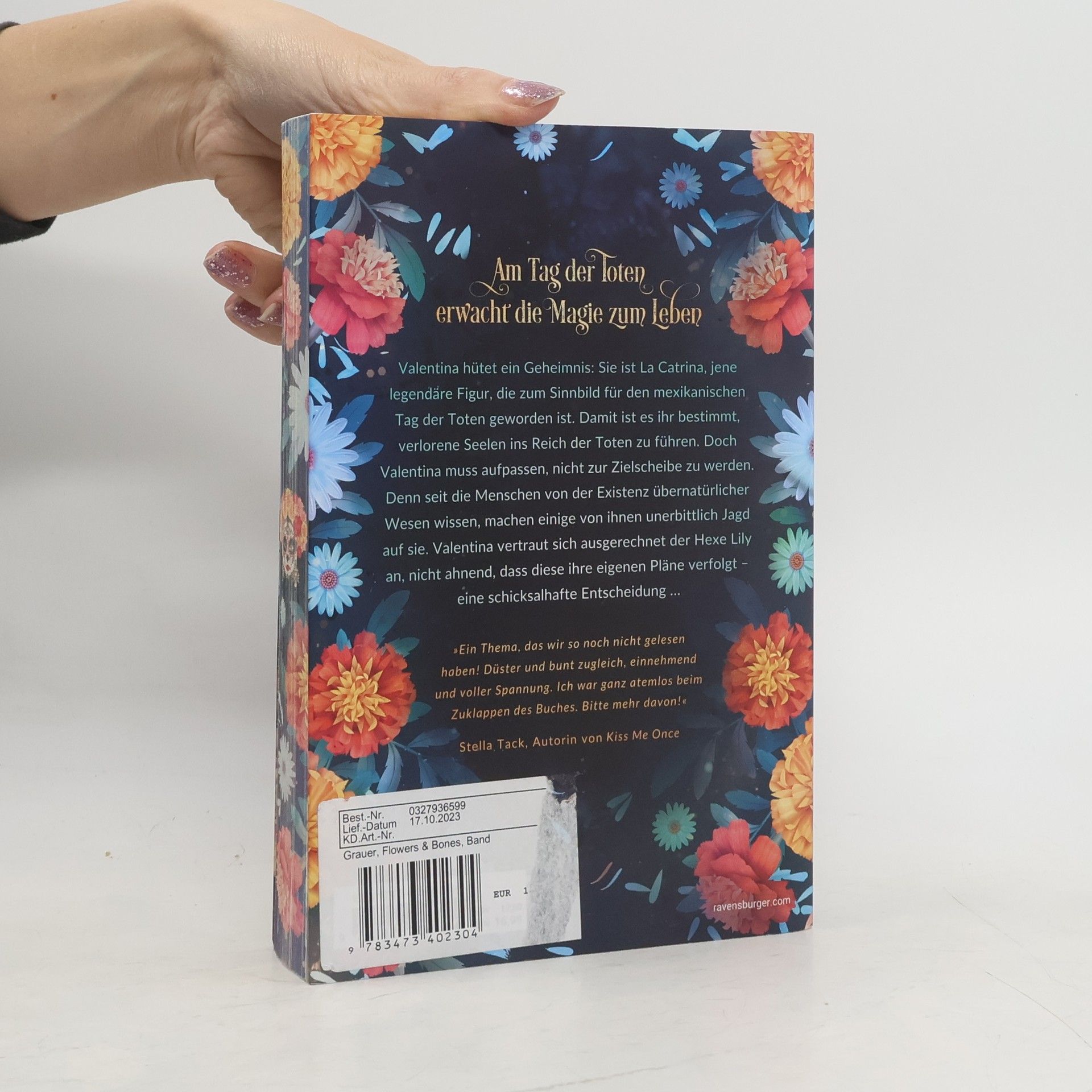 Am Tag der Toten erwacht die Magie zum Leben Valentina hütet ein Geheimnis: Sie ist La Catrina, jene legendäre Figur, die zum Sinnbild für den mexikanischen Tag der Toten geworden ist. Damit ist es ihr bestimmt, verlorene Seelen ins Reich der Toten zu führen. Doch Valentina muss aufpassen, nicht zur Zielscheibe zu werden. Denn seit die Menschen von der Existenz übernatürlicher Wesen wissen, machen einige von ihnen unerbittlich Jagd auf sie. Valentina vertraut sich ausgerechnet der Hexe Lily an, nicht ahnend, dass diese ihre eigenen Pläne verfolgt – eine schicksalhafte Entscheidung … *** Urban Romantasy vor der atmosphärischen Kulisse des Día de los Muertos! Episch. Traumhaft. Magisch! *** Entdecke die fantastisch-romantischen Buchwelten von Sandra Grauer bei Ravensburger: Flowers & Bones Band 1: Tag der Seelen Band 2: Kuss der Catrina Flame & Arrow Band 1: Drachenprinz Band 2: Elfenkriegerin Clans of London Band 1: Hexentochter Band 2: Schicksalsmagie