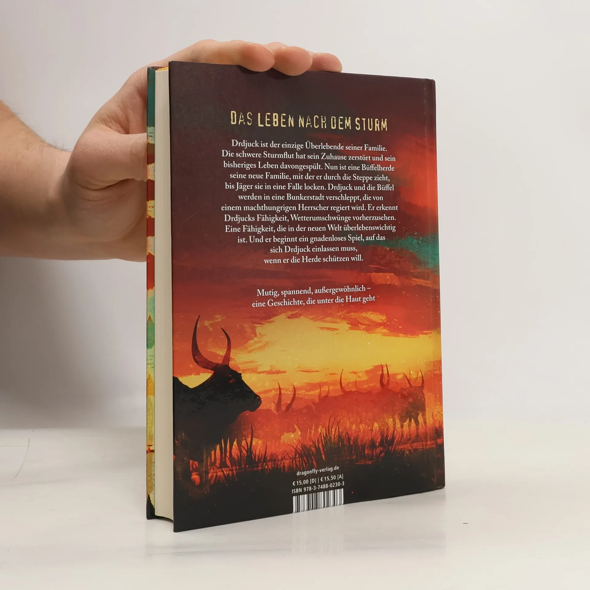 Der Kampf gegen die Elemente, bei dem nur einer den Weg des Überlebens kennt Drdjuck ist der einzige Überlebende seiner Familie. Die schwere Sturmflut hat sein Zuhause zerstört und sein bisheriges Leben davongespült. Nun ist eine Büffelherde seine neue Familie, mit der er durch die Steppe zieht, bis Jäger sie in eine Falle locken und gefangen nehmen. Drdjuck und die Büffel werden in eine Bunkerstadt verschleppt. Aufgrund der neuen Wetterphänomene ist der Mensch nicht mehr in der Lage, außerhalb von Schutzräumen zu überleben. Nur Drdjuck kann das, denn er hat gelernt, die Zeichen der Natur zu lesen. Nun steht er einer überlebenshungrigen, gnadenlosen Gesellschaft gegenüber, die mit Angst vor der Welt außerhalb der Stadt regiert wird. Ihr Herrscher erkennt Drdjucks Fähigkeiten, die für ihn Hoffnung und Gefahr zugleich bedeutet. Der Junge und seine Büffel werden nur so lange überleben, wie sie von Nutzen sind. Ein bildgewaltiger und fesselnd erzählter Jugendroman von Bestsellerautor Boris Pfeiffer (Die drei ???-Kids) Klimakrise, ungewöhnliche Wetterphänomene und der Überlebenskampf des Menschen in einer Welt von morgen, die schon heute droht