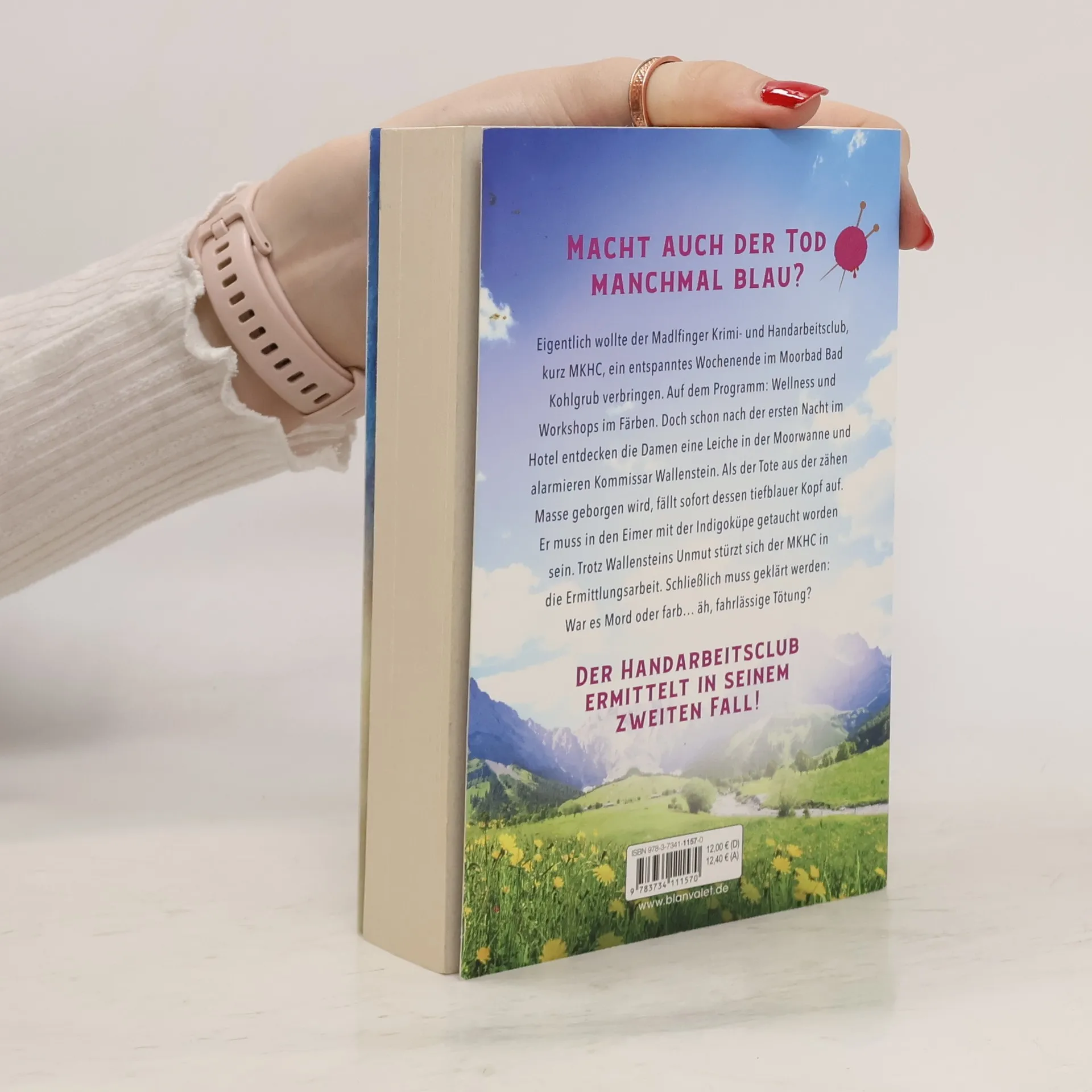 Tödliches Blaumachen im bayerischen Idyll – der Madlfinger Krimi- und Handarbeitsclub ermittelt in seinem zweiten Fall! Macht auch der Tod manchmal blau? Eigentlich wollte der Madlfinger Krimi- und Handarbeitsclub, kurz MKHC, ein entspanntes Wochenende im Moorbad Bad Kohlgrub verbringen. Auf dem Programm: Wellness und Workshops im Färben. Doch nach einer weinseligen Nacht entdecken die Damen eine Leiche in der Moorwanne und alarmieren Kommissar Wallenstein. Als der Tote aus der zähen Masse geborgen wird, fällt sofort dessen tiefblauer Kopf auf. Er muss in den Eimer mit der Indigoküppe getaucht worden sein. Trotz Wallensteins Unmut stürzt sich der MKHC in die Ermittlungsarbeit. Schließlich muss geklärt werden: War es Mord oder farb… äh, fahrlässige Tötung? Lesen Sie mehr über die tödlichen Verstrickungen in »Maschenmord« – Fall 1 für den MKHC und Kommissar Wallenstein.