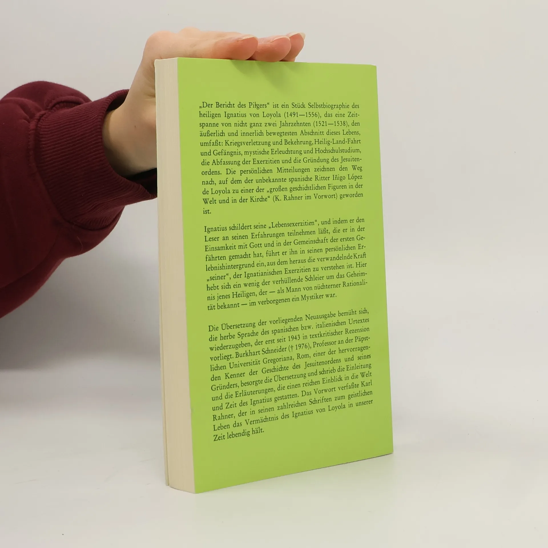 Im „Bericht des Pilgers“ schildert Ignatius von Loyola (1491-1556) die äußerlich und innerlich bewegteste Zeit seines Lebens: Kriegsverletzung und Krankenlager, Bekehrung und neue geistliche Erfahrung, Pilgerfahrt nach Rom und ins Heilige Land, Beginn seines Studiums, mehrere Inquisitionsprozesse und wochenlange Untersuchungshaften, die Jahre an der Priester Universität, wo er Gefährten findet, mit denen er später in Rom den Jesuitenorden gründen wird. In schlichter, genauer und anschaulicher Sprache läßt Ignatius die Leserinnen und Leser daran teilnehmen, wie er sich auf diesem Weg von Gott geleitet erfuhr. Der Bericht ist eine der Hauptquellen zur Entstehung des Buches der „Geistlichen Übungen“ und seiner Regeln zur „Unterscheidung der Geister“. Der von Peter Knauer SJ übersetzten und ausführlich kommentierten Ausgabe sind Auszüge aus dem Tagebuch des Zürcher Glockengießers Peter Füessli beigegeben, der bei der Wallfahrt des Ignatius nach Jerusalem zur gleichen Pilgergruppe gehörte.
