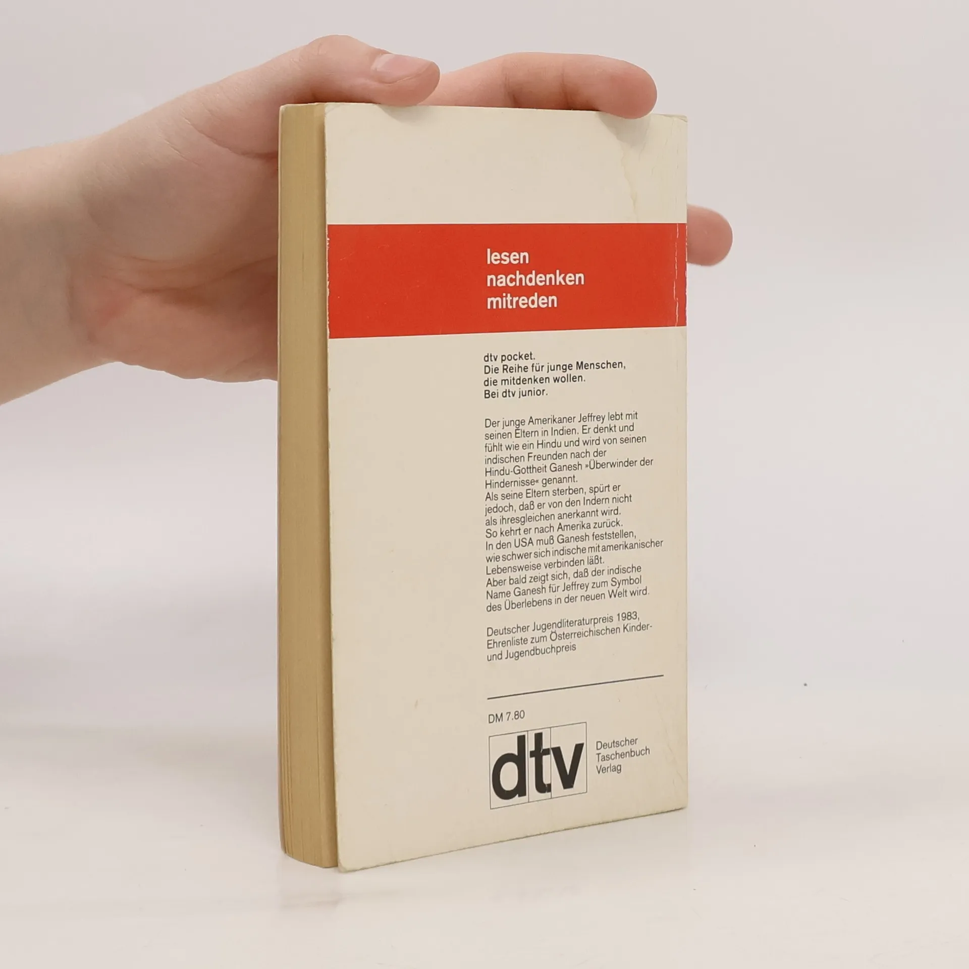 Der junge Amerikaner Jeffrey lebt mit seinen Eltern in Indien. Er denkt und fühlt wie ein Hindu und wird von seinen indischen Freunden nach der Hindu-Gottheit Ganesh "Überwinder der Hindernisse" genannt. Als seine Eltern sterben, spürt er jedoch, dass er von den Indern nicht als ihresgleichen anerkannt wird. So kehrt er nach Amerika zurück. In den USA muss Ganesh feststellen, wie schwer sich indische mit amerikansicher Lebensweise verbinden lässt. Aber bald zeigt sich, dass der indische Name Ganesh für Jeffrey zum Symbol des Überlebens in der neuen Welt wird.§Deutscher Jugendliteraturpreis. Ehrenliste zum Österreichischen Kinder- und Jugendbuchpreis