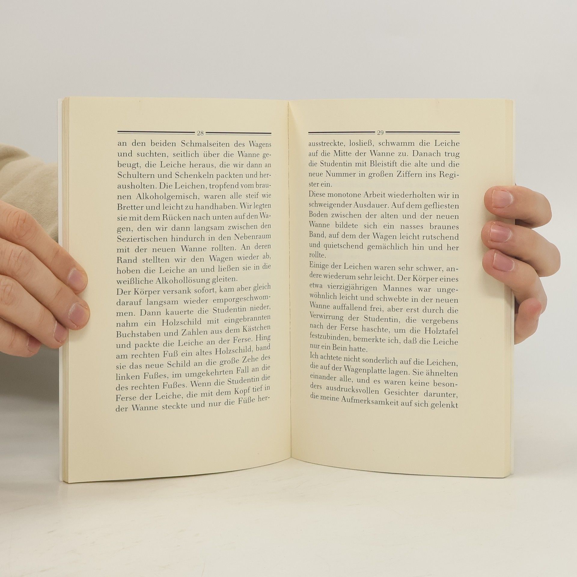 In seinen Romanen, Erzählungen, Essays geht es immer um Ekel, Grausamkeit und vor allem und immer wieder um die moralische Labilität der Mitglieder der Nachkriegsgesellschaft. In der vorliegenden Erzählung fällt einem Romanistikstudenten und seiner Kollegin von der Anglistik eine besonders makabre Arbeit zu. In der Prosektur einer Universitätsklinik müssen sie Leichen aus einem Alkohol-Bassin in ein anderes umladen. Nicht nur der Job ist widerwärtig, sondern auch der Auftraggeber, ein Medizinprofessor. Nach Beendigung der Arbeit erfahren die Werkstudenten, daß ihre Mühe vergeblich war. Die Leichen sollten gar nicht mehr zur Forschung oder Ausbildung verwendet, sondern im Krematorium verbrannt werden. Es bleibt ungewiß, ob ihnen ihr Arbeitslohn überhaupt ausbezahlt wird.