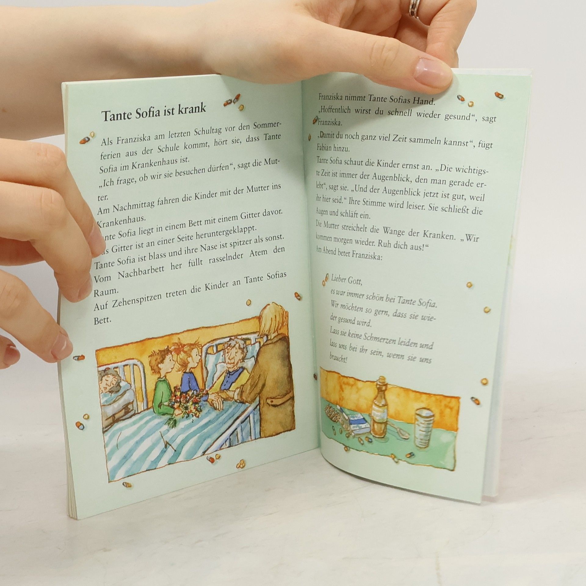Franziska und Fabian schließen Freunschaft mit der alten Tante Sofia. Bei ihren Besuchen erfahren sie vieles über ihr Leben und über ihre Vorstellungen und Hoffnungen, was nach ihrem Tod sein wird. Dann stirbt Tante Sofia. Die Geschichte eignet sich für Gespräch über Sterben und Tod. Sie bietet Kindern die Möglichkeit, eigene Fragen und Ängste auszusprechen.