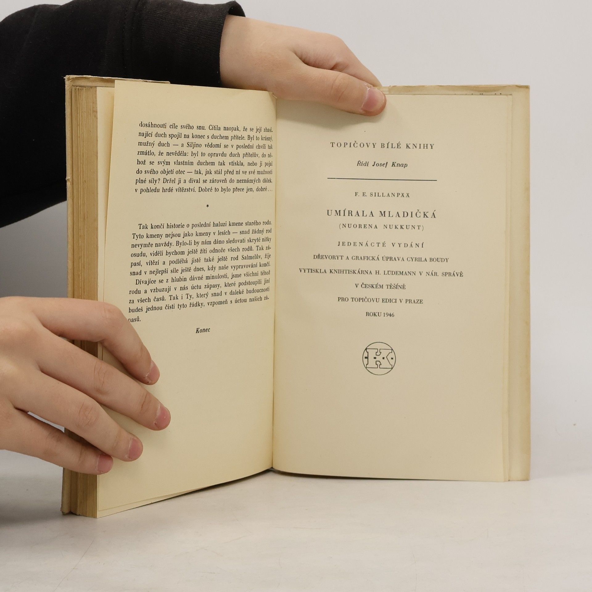 V nejslavnějším románě Umírala mladičká z r. 1931 vyjádřil autor na tragickém příběhu chudé venkovské dívky Silji, jejího osamělého dětství, veliké lásky a smrtelné nemoci jedinečným způsobem symbiózu člověka a přírody. Jednoduchá linie vyprávění je prolnutá popisem přírody,často uváděným do vztahu se stavem duše. Opakovaný motiv léta jako symbol životního naplnění hrdinky ostře kontrastuje s její osudovou a nevyhnutelnou smrtí, jejíž finále je připravováno od samého počátku. Autor za tento román obdržel v r. 1939 Nobelovu cenu. Dřevoryt a grafická úprava Cyrila Boudy.