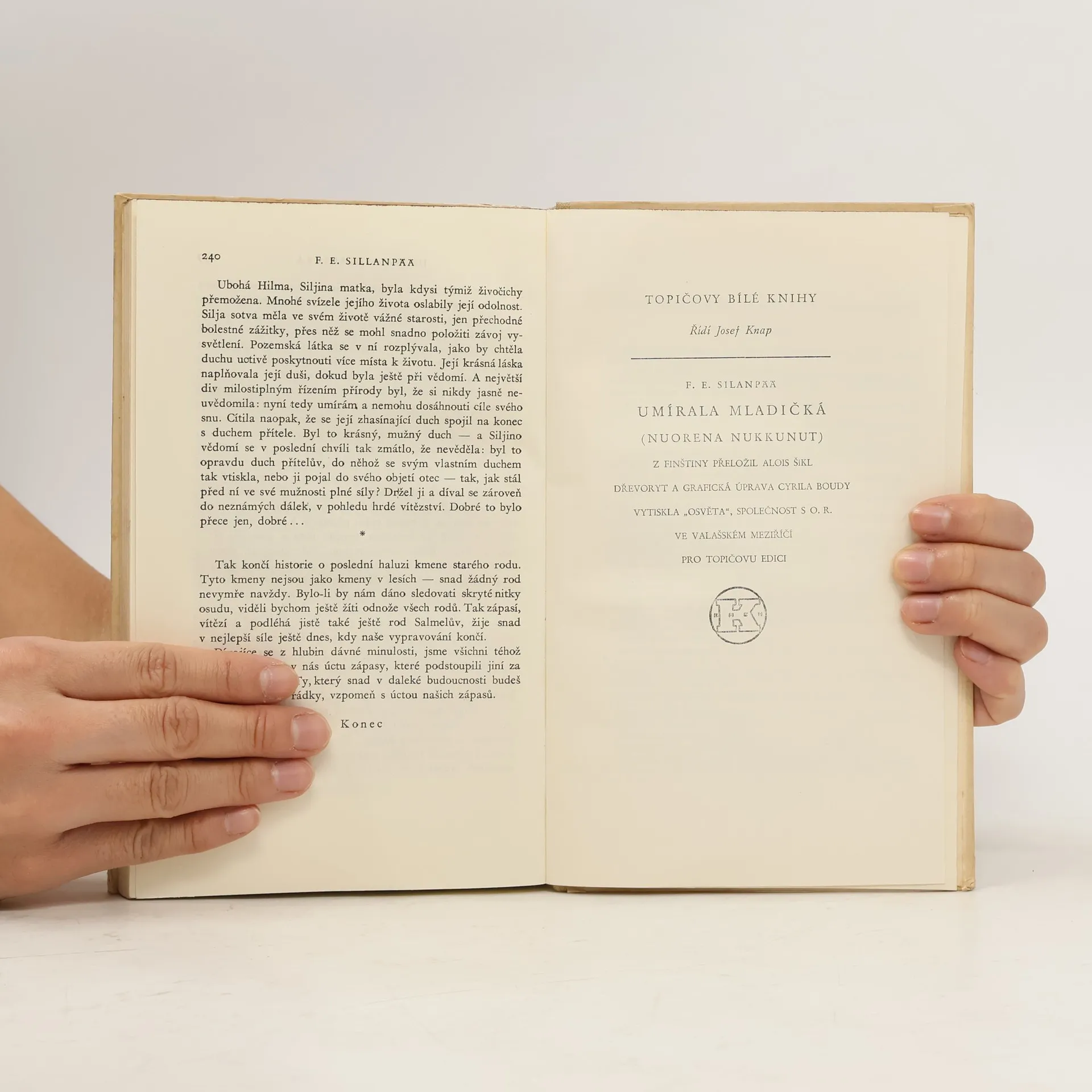 V nejslavnějším románě Umírala mladičká z r. 1931 vyjádřil autor na tragickém příběhu chudé venkovské dívky Silji, jejího osamělého dětství, veliké lásky a smrtelné nemoci jedinečným způsobem symbiózu člověka a přírody. Jednoduchá linie vyprávění je prolnutá popisem přírody,často uváděným do vztahu se stavem duše. Opakovaný motiv léta jako symbol životního naplnění hrdinky ostře kontrastuje s její osudovou a nevyhnutelnou smrtí, jejíž finále je připravováno od samého počátku. Autor za tento román obdržel v r. 1939 Nobelovu cenu. Dřevoryt a grafická úprava Cyrila Boudy.