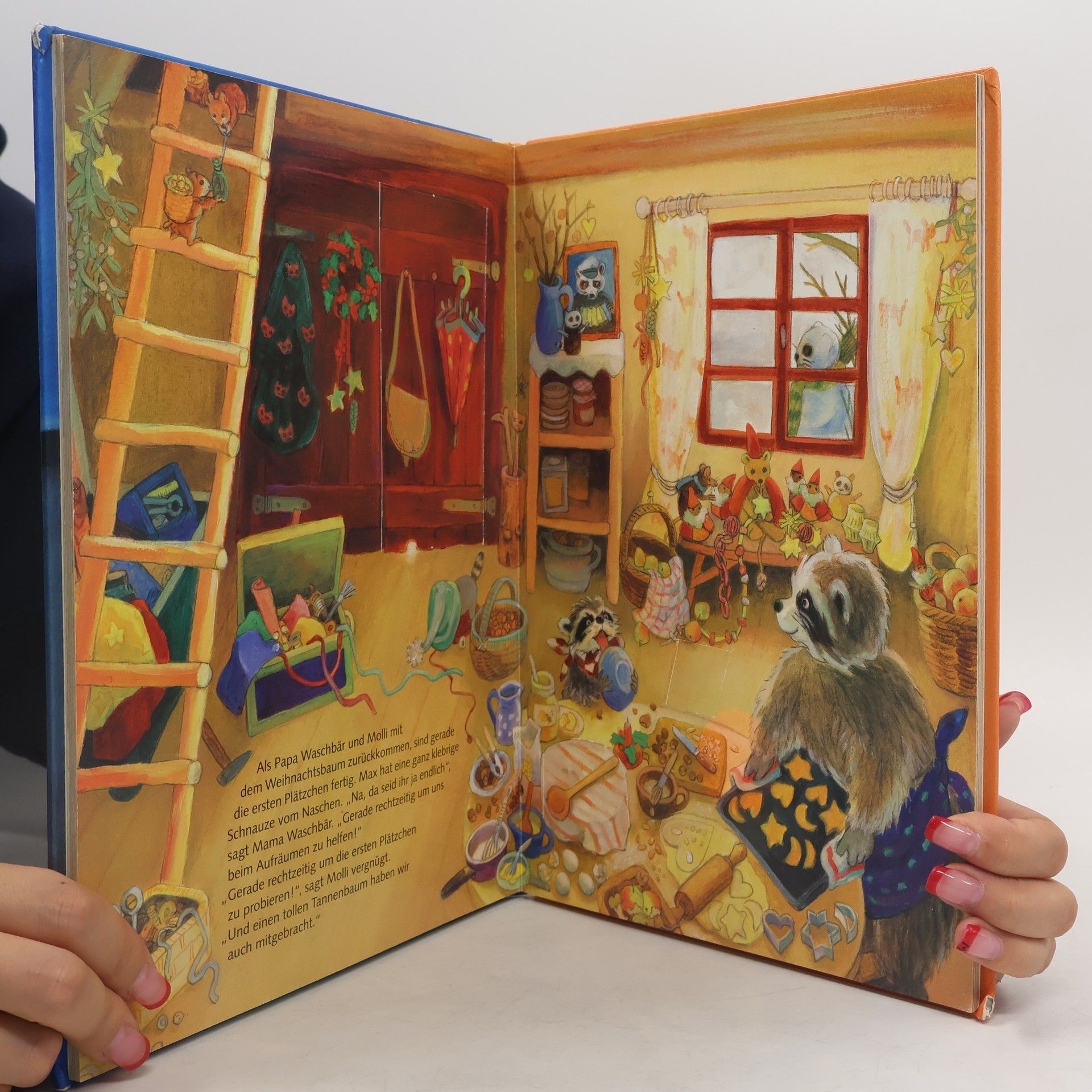 Weihnachtsvorbereitungen bei Familie Waschbär: Basteln, Backen, Baumschmücken.