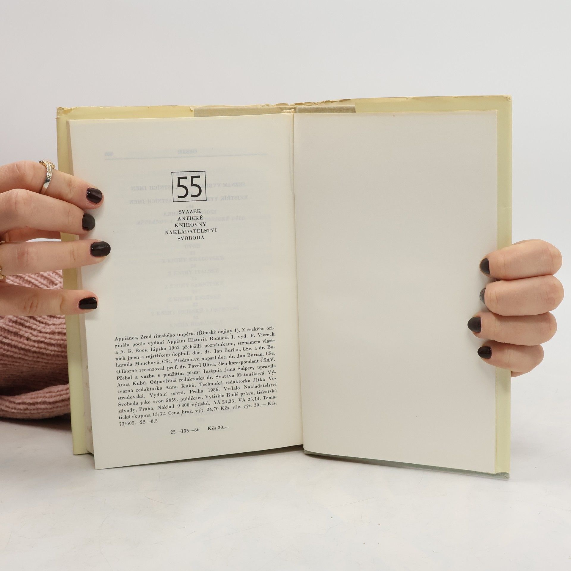Římské dějiny II - Občanské války. Alexendrijský Řek Appiános, narozený na sklonku 1. století našeho letopočtu, vylíčil nejen vznik římského impéria a jeho rozpínavost, nýbrž i dějiny římských občanských válek. V pěti knihách, které jim věnoval, sleduje dlouhou a téměř nepřetržitou řadu sociálních a politických konfliktů od poslední třetiny 2. století př. n. l. až do roku 35 n.l. Hnutí bratří Gracchů, kteří své reformy zaplatili životem, válka se spojenci, politické vyrovnání mariovců a sullovců, vzpoura otroků vedených Spartakem - to jsou úseky z římských dějin, o ncihž Appiános pojednává podrobně i se zaujetím v první knize. Dále pokračuje scénami z bojů mezi Caesarem a Pompeiem, Caesarovým vítězstvím i jeho vraždou. Ještě větší napětí vkládá do vyprávění o marném zápase Bruta a Cassia za republikánskou svobodu. Nečekané zvraty provázejí stejně nečekaný a energický vstup devatenáctiletého Octaviana, Caesarova adoptivního syna a pozdějšího císaře Augusta, do neklidného politického života po Caesarově smrti... Ve svém díle se Appiános zaměřuje na významné politické osobnosti - v souladu se starověkou koncepcí historie je totiž povaužje za hlavní činitele dějin - a přibližuje čtenáři jejich velikost nebo malost, odhaluje příčiny a souvislosti jejich vítězství i proher, klade závažné otázky a snaží se nalézt a nalézá zajímavé, i když mnohdy velmi subjektivní odpovědi.