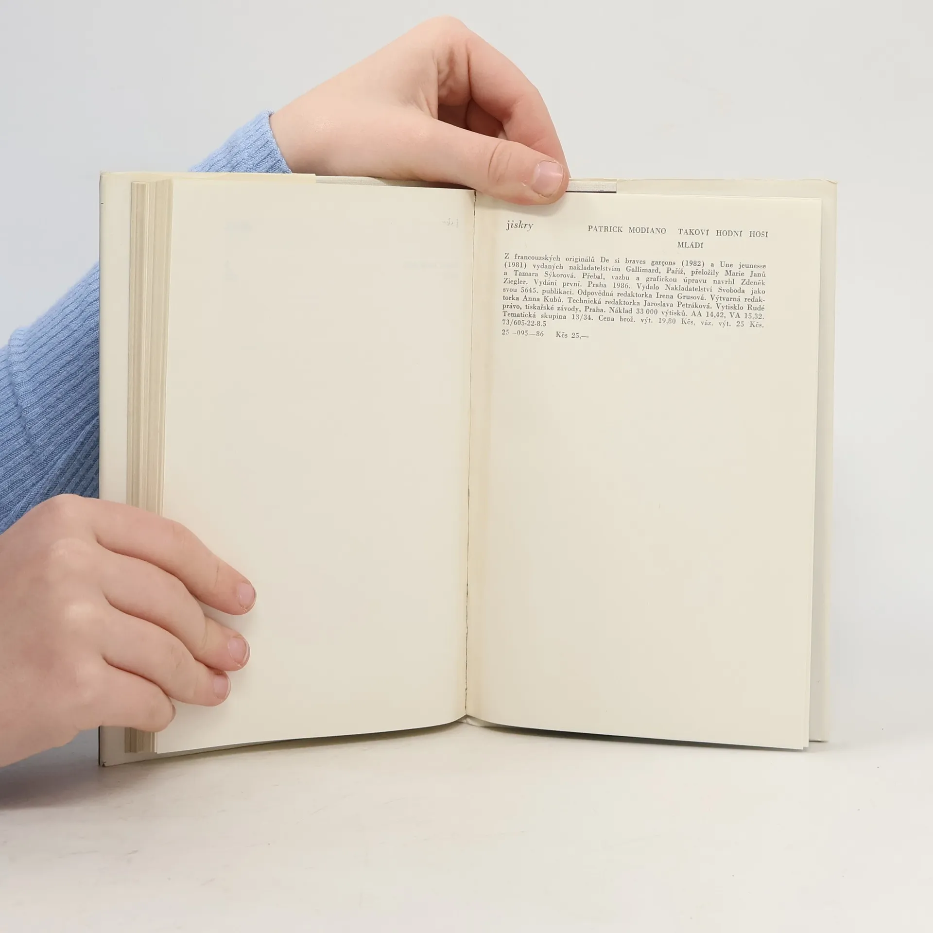 Jací vlastně byli a co se stalo s těmi „takovými hodnými hochy", někdejšími spolužáky z elitní koleje, které nám představuje P. Modiano v první části svazku, románu Takoví hodní hoši (1982)? Karvé nadobro opustil své rodiče, podvodníky na vysoké úrovni, Portier trpěl, že jeho matka je ženou vydržovanou milionáři, Winegrain zosnoval z uražené ješitnosti kruté zostuzení sestry jednoho spolužáka, ani Claude se nestal velkým hercem, rozmazlený Desoto podlehl podivnému infantilismu jako „monarcha" tenisového klubu, Charell se ocitl v pekelném kruhu narkomanů, stárnoucí dandy Yotlande bezcílně ubíjel čas... A samotný vypravěč? Víme o něm, že ho nazývali snílkem a že píše detektivní romány. I on sám zřejmě nenašel zakotvení, a proto stále hledá svou pravou tvář. Druhou část svazku tvoří román Mládí (1983).