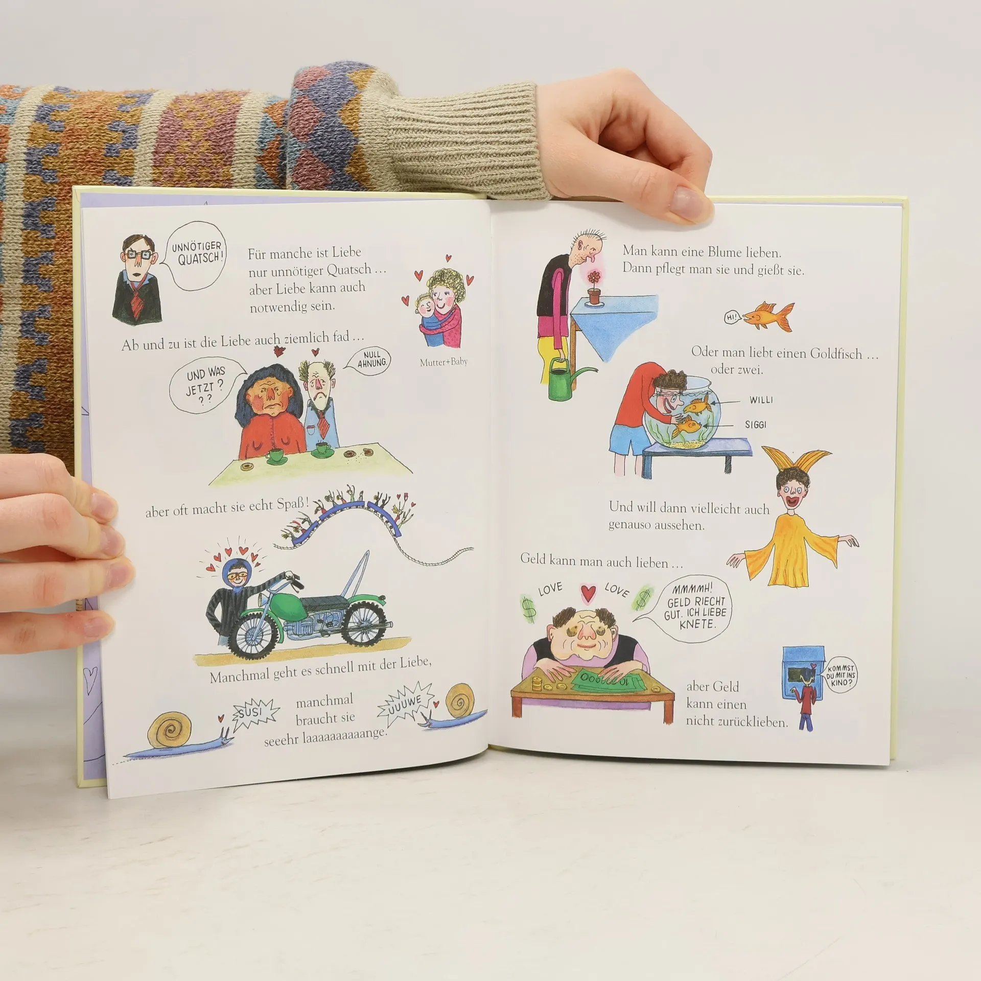 Die Liebe geht uns alle an! Deshalb betrachtet Pernilla Stalfelt sie auch aus den unterschiedlichsten Blickwinkeln: Liebe zwischen Eltern und Kindern, Liebe zu Tieren, Liebe zu Gott (oder Allah oder Buddha), gleichgeschlechtliche Liebe, albernmachende Liebe, unerwiderte Liebe. Sie zeigt, wie Anmache funktioniert, wie ein Hochzeitspaar aussieht und was man anstellen muss, 'falls man so verliebt ist, dass man Kinder machen will'. Sie stellt uns Amor vor und ein Liebestrank-Rezept (mit Mondgeglitzer). Das alles tut Pernilla Stalfelt in ihrer unverwechselbaren Art, mit der sie Kindern schon (fast) alle Fragen um Tod und Sterben, Gewalt oder Kacke beantwortet hat. Ihre Zeichnungen stecken voller Witz und lassen sich ganz und gar auf Kinder ein – kein Wunder, weiß sie doch als Museumspädagogin genau, welche Fragen Kindern wichtig sind.