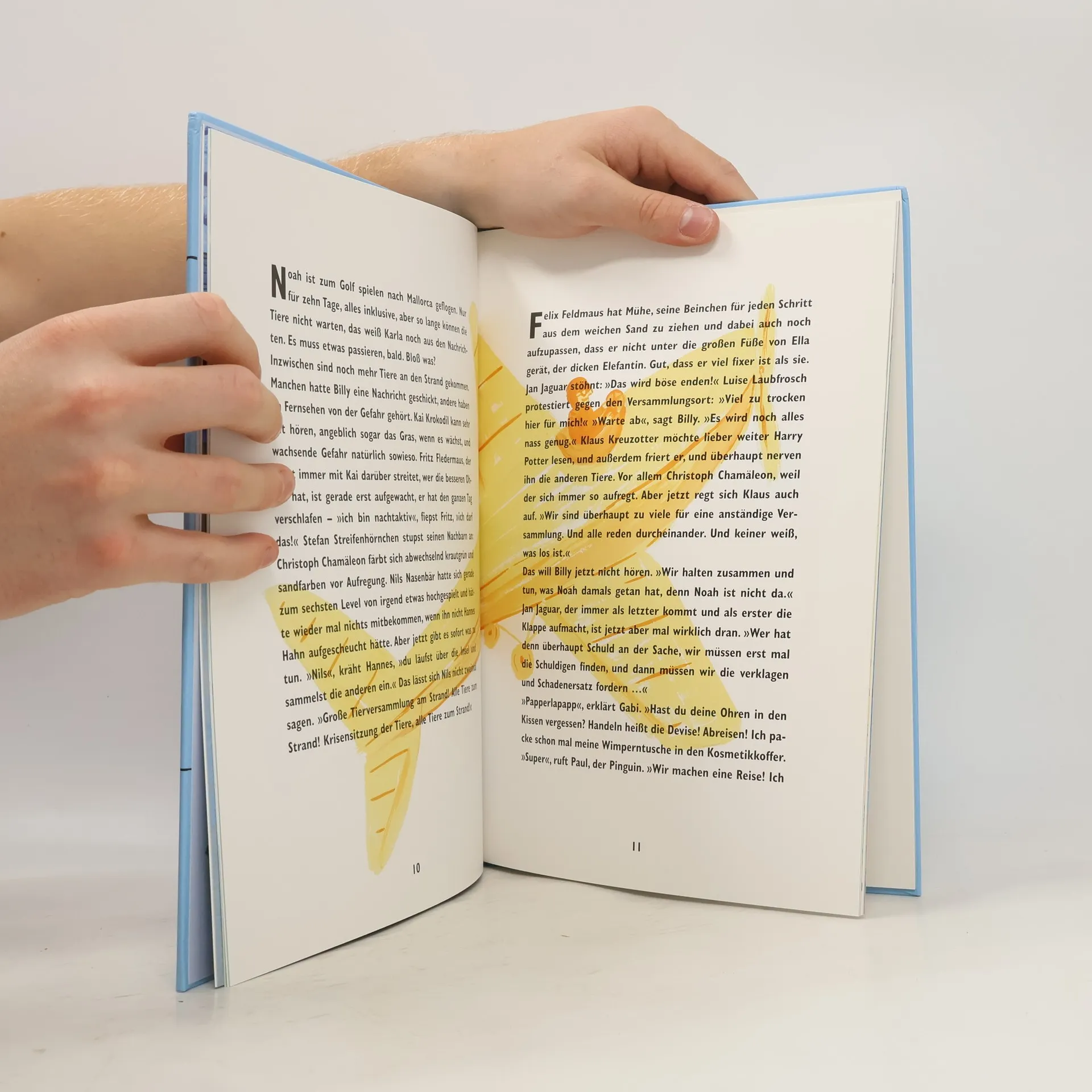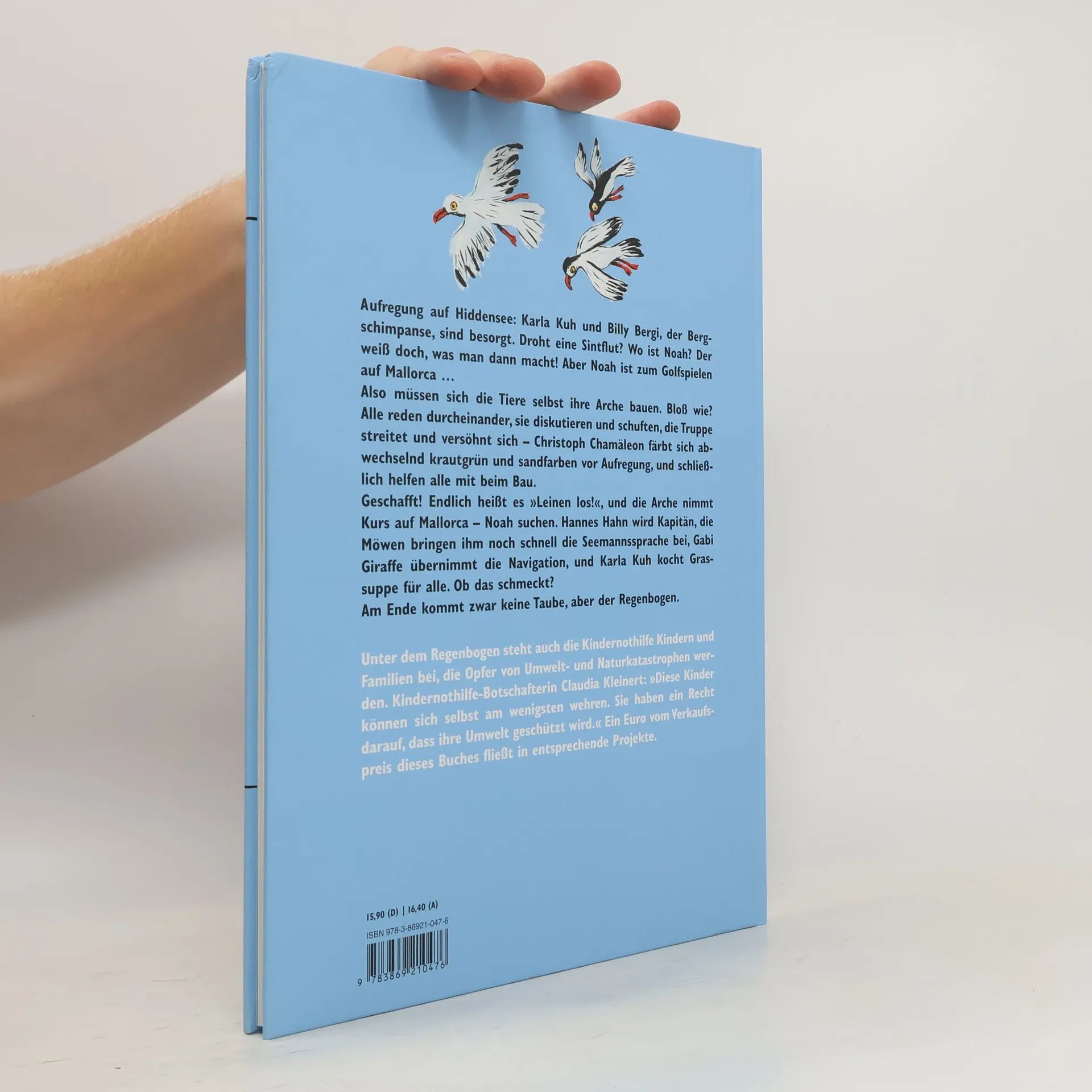 Aufregung auf Hiddensee: Karla Kuh und Billy Bergi, der Bergschimpanse, sind besorgt. Droht eine Sintflut? Wo ist Noah? Der weiß doch, was man dann macht! Aber Noah ist zum Golfspielen auf Mallorca … Also müssen sich die Tiere selbst ihre Arche bauen. Bloß wie? Alle reden durcheinander, sie diskutieren und schuften, die Truppe streitet und versöhnt sich – Christoph Chamäleon färbt sich abwechselnd krautgrün und sandfarben vor Aufregung, und schließlich helfen alle mit beim Bau. Geschafft! Endlich heißt es 'Leinen los!', und die Arche nimmt Kurs auf Mallorca – Noah suchen. Hannes Hahn wird Kapitän, die Möwen bringen ihm noch schnell die Seemannssprache bei, Gabi Giraffe übernimmt die Navigation, und Karla Kuh kocht Grassuppe für alle. Ob das schmeckt? Am Ende kommt zwar keine Taube, aber der Regenbogen. Unter dem Regenbogen steht auch die Kindernothilfe Kindern und Familien bei, die Opfer von Umwelt- und Naturkatastrophen werden. Kindernothilfe-Botschafterin Claudia Kleinert: 'Diese Kinder können sich selbst am wenigsten wehren. Sie haben ein Recht darauf, dass ihre Umwelt geschützt wird.' Ein Euro vom Verkaufspreis dieses Buches fließt in entsprechende Projekte.