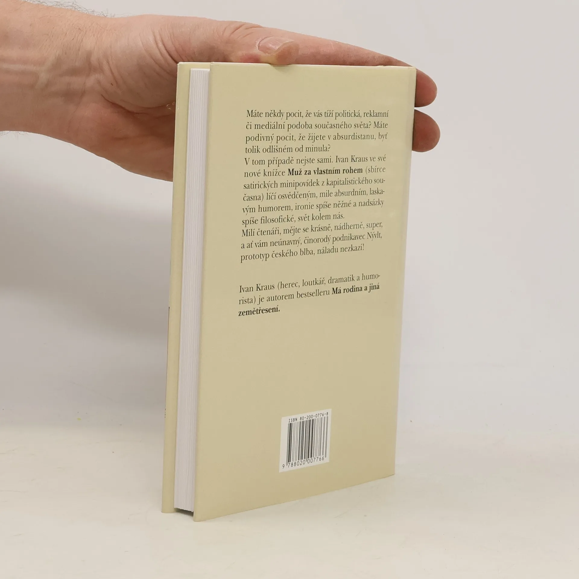 Máte někdy pocit, že vás tíží politická, reklamní či mediální podoba současného světa? Máte podivný pocit, že žijete v Absurdistánu, byť tolik odlišném od minula? V tom případě nejste sami. Sbírka satirických minipovídek z kapitalistického současna Muž za vlastním rohem líčíosvědčeným, mile laskavým humorem svět kolem nás. Milí čtenáři, mějte se krásně, nádherně, super, a ať vám neúnavný, činorodý podnikavec Nývlt, prototyp českého člověka, nezkazí náladu! Dotisky v roce 2000, 2002, 2003 a 2010.