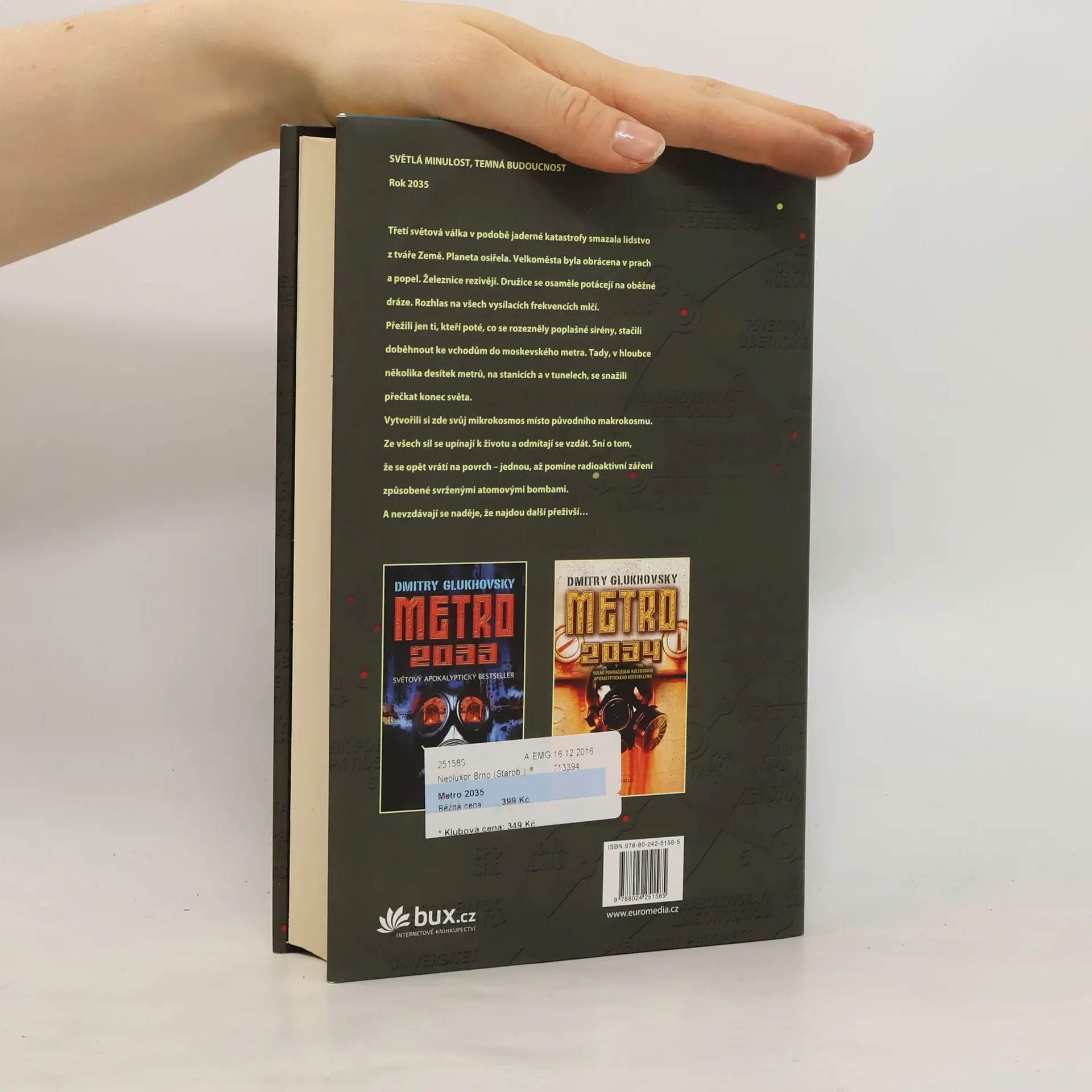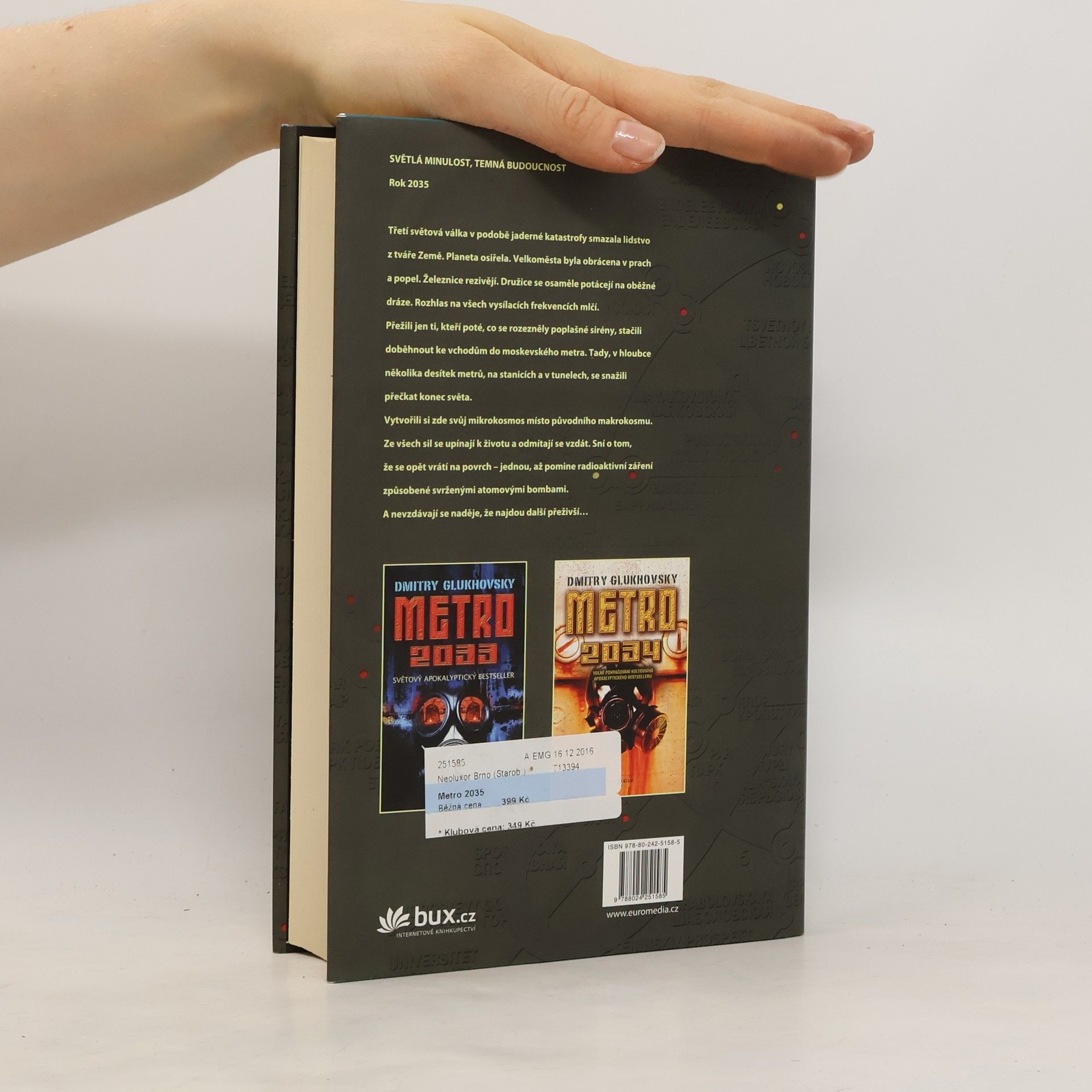 Třetí světová válka smazala lidstvo z tváře Země. Planeta osiřela. Velkoměsta byla obrácena v prach a popel. Železnice rezivějí. Družice se osaměle potácejí na oběžné dráze. Rozhlas na všech vysílacích frekvencích mlčí. Přežili jen ti, kteří poté, co se rozezněly poplašné sirény, stačili doběhnout ke vchodům do moskevského metra. Tady, v hloubce několika desítek metrů, na stanicích a v tunelech, se lidé snaží přečkat konec světa. Vytvořili si zde svůj mikrokosmos místo původního makrokosmu. Ze všech sil se upínají k životu a odmítají se vzdát. Sní o tom, že se vrátí na povrch – jednou, až pomine radioaktivní záření způsobené svrženými jadernými bombami. A nevzdávají se naděje, že najdou další přeživší… Metro 2035 završuje příběh Arťoma z první knihy kultovní trilogie. Na tuto knihu miliony čtenářů čekaly řadu let a zahraniční nakladatelé zakoupili práva na překlad dávno předtím, než byl román dokončen.
