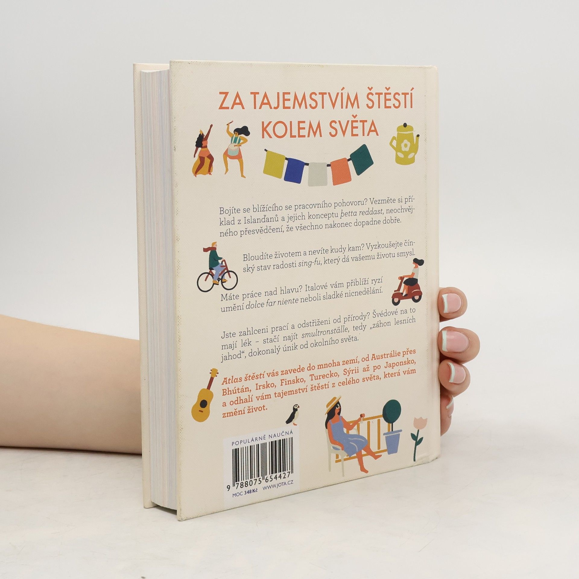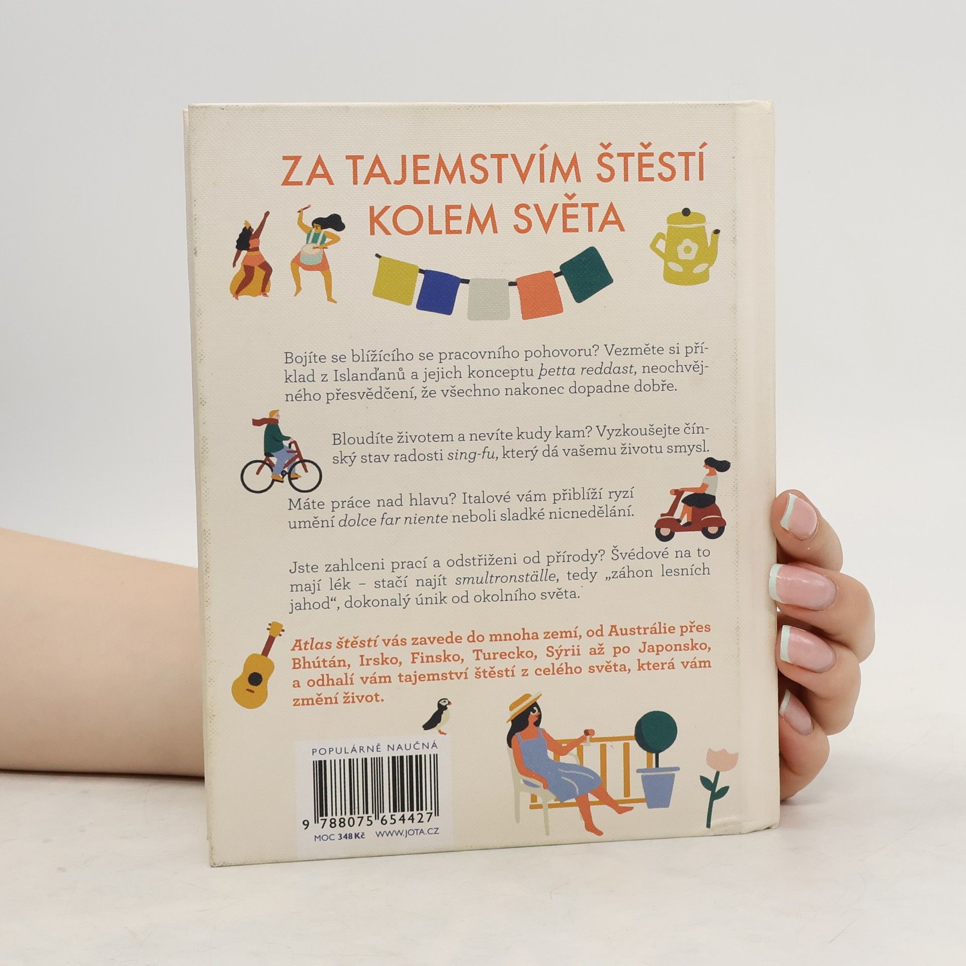Cesta kolem světa a 33 mezinárodních návodů, jak dosáhnout štěstí. Bojíte se blížícího se pracovního pohovoru? Vezměte si příklad z Islanďanů a jejich konceptu þetta reddast, neochvějného přesvědčení, že všechno nakonec dopadne dobře.Bloudíte životem a nevíte kudy kam? Vyzkoušejte čínský stav radosti sing-fu, který dá vašemu životu smysl.Máte práce nad hlavu? Italové vám přiblíží ryzí umění dolce far niente neboli sladké nicnedělání.Jste zahlceni prací a odstřiženi od přírody? Švédové na to mají lék – stačí najít smultronställe, tedy „záhon lesních jahod“, dokonalý únik od okolního světa.Atlas štěstí vás zavede do mnoha zemí, od Anglie přes Bhútán, Irsko, Finsko, Turecko, Sýrii až po Japonsko a odhalí vám taje štěstí z celého světa, které vám změní život.