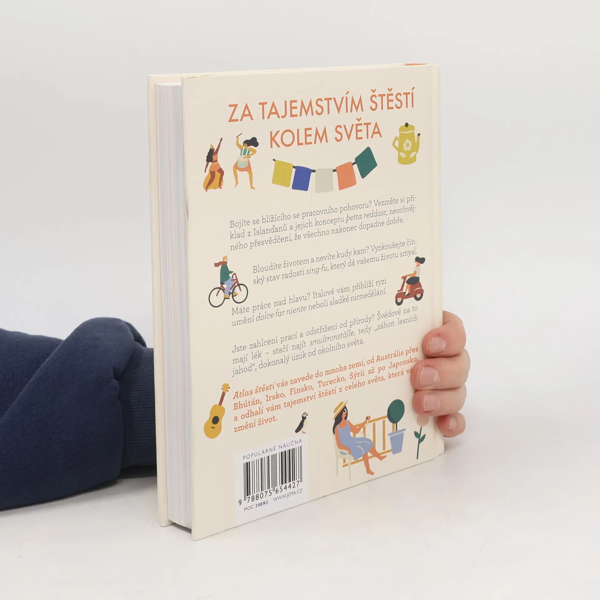 Cesta kolem světa a 33 mezinárodních návodů, jak dosáhnout štěstí. Bojíte se blížícího se pracovního pohovoru? Vezměte si příklad z Islanďanů a jejich konceptu þetta reddast, neochvějného přesvědčení, že všechno nakonec dopadne dobře.Bloudíte životem a nevíte kudy kam? Vyzkoušejte čínský stav radosti sing-fu, který dá vašemu životu smysl.Máte práce nad hlavu? Italové vám přiblíží ryzí umění dolce far niente neboli sladké nicnedělání.Jste zahlceni prací a odstřiženi od přírody? Švédové na to mají lék – stačí najít smultronställe, tedy „záhon lesních jahod“, dokonalý únik od okolního světa.Atlas štěstí vás zavede do mnoha zemí, od Anglie přes Bhútán, Irsko, Finsko, Turecko, Sýrii až po Japonsko a odhalí vám taje štěstí z celého světa, které vám změní život.