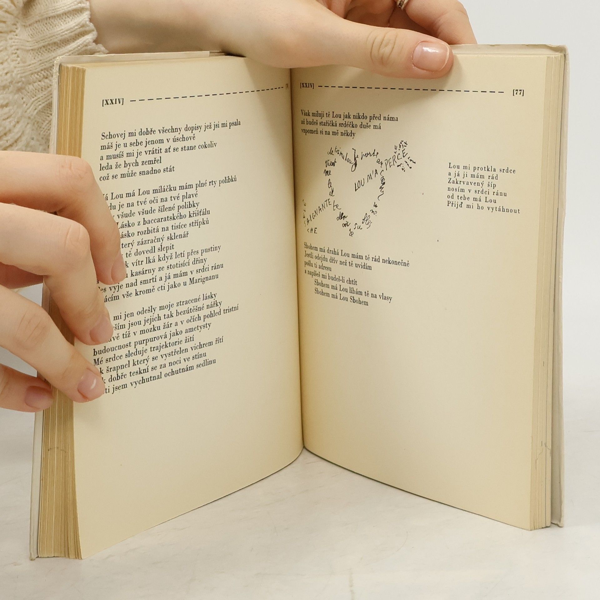 Výběr Apollinairových kaligramů z jeho básnických sbírek (nejen ze sbírky Kaligramy), některé v původní grafické podobě a v originále. Kaligramy jsou nejméně často vydávanými Apollinairovými básněmi (pro náročnost tisku). S doslovem Vladimíra Diviše, zaměřeném na Apollinairovu sbírkuKaligramy.