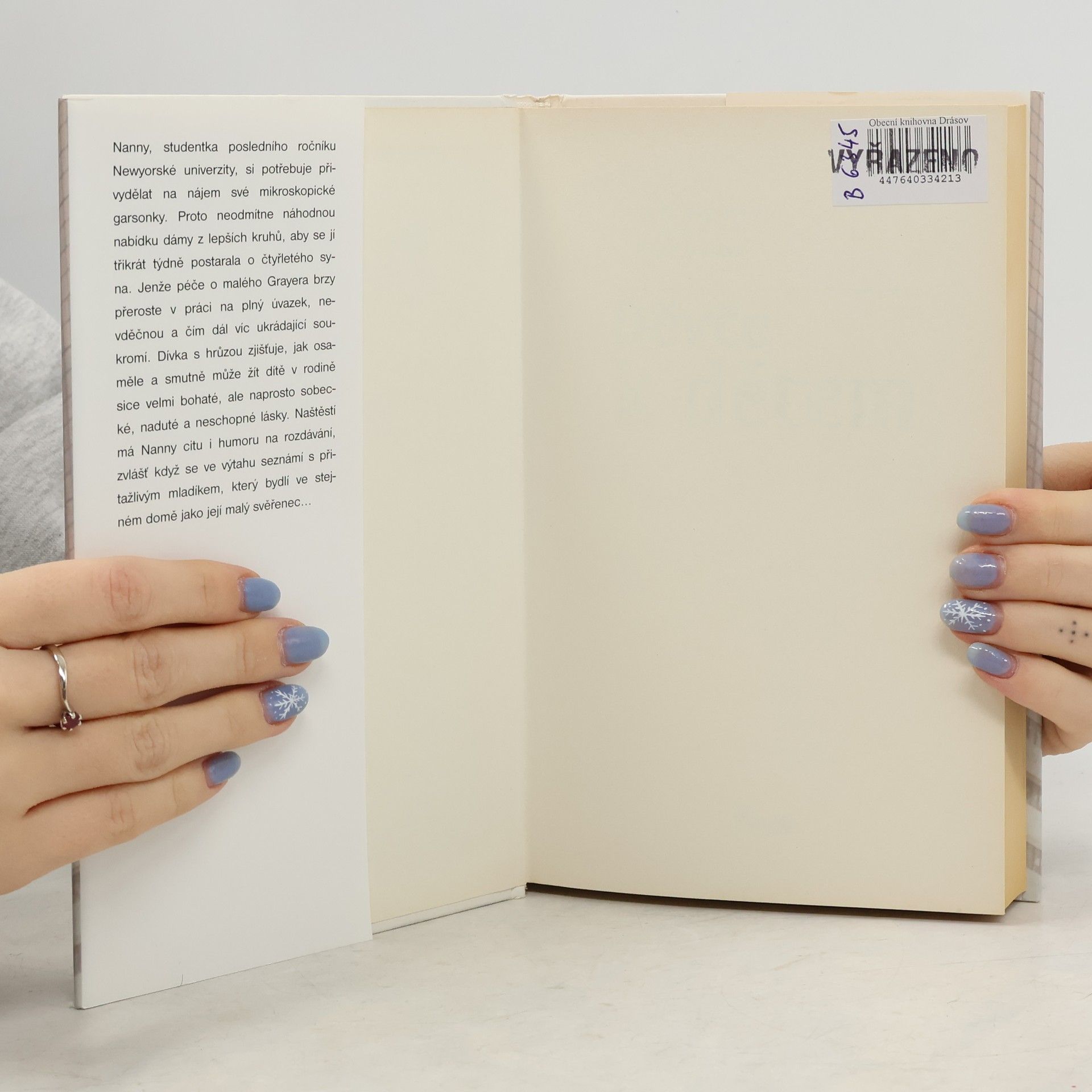 Nanny, studentka posledního ročníku Newyorské univerzity, si potřebuje přivydělat na nájem. Proto neodmítne náhodnou nabídku dámy z lepších kruhů, aby se jí třikrát týdně postarala o čtyřletého syna. Jenže péče o malého Grayera brzy přeroste v práci na plný úvazek, nevděčnou a čím dál víc ukrádající soukromí. Dívka s hrůzou zjišťuje, jak osaměle a smutně může žít dítě rodičů sice velmi bohatých, ale sobeckých, nadutých a neschopných lásky. Kniha se v roce 2007 dočkala i filmového zpracování. Do českých kin vstoupil film pod názvem Holka na hlídání.