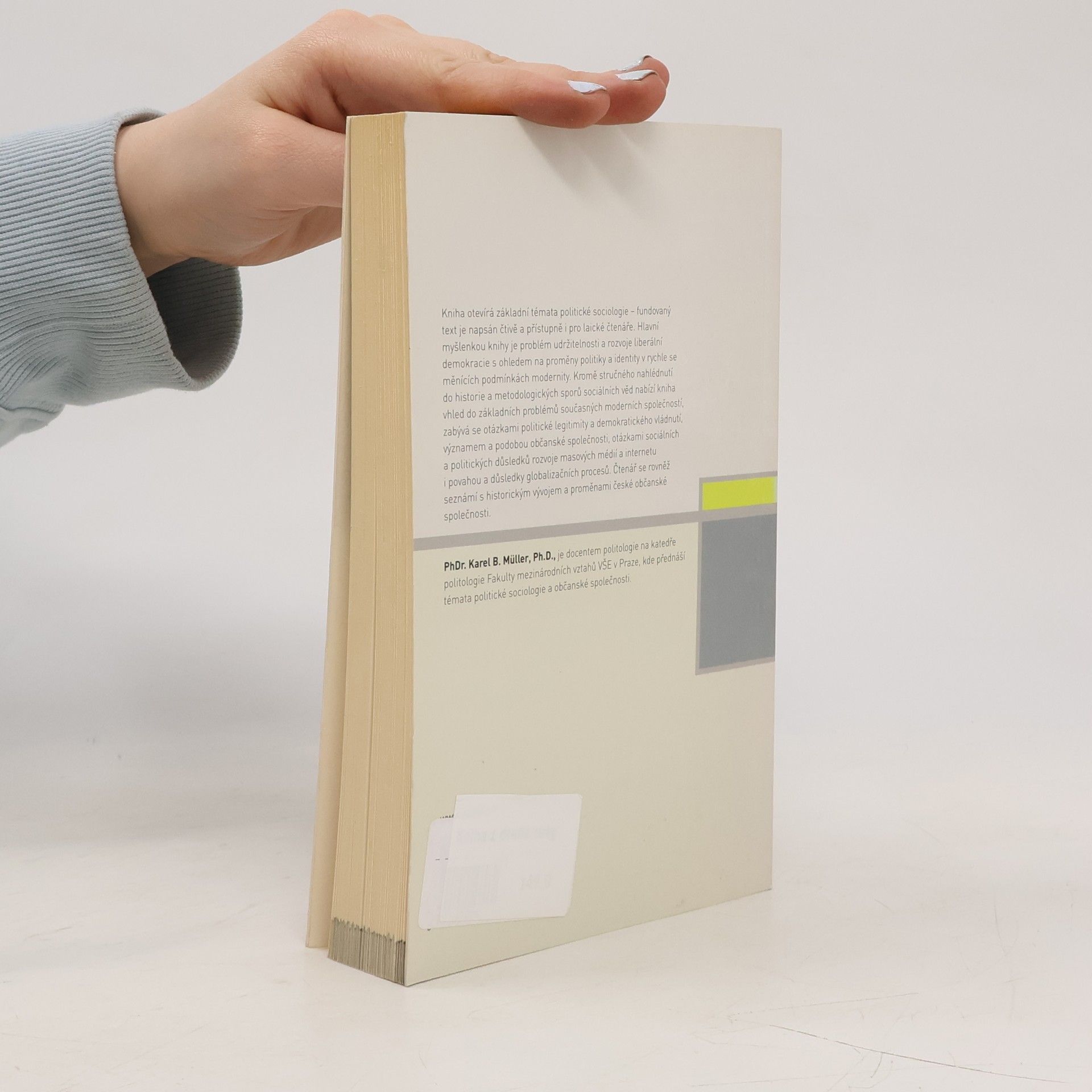 Politika a identita v proměnách modernity. Kniha otevírá základní témata politické sociologie způsobem, který je poučený a přístupný i laickému čtenáři. Hlavní myšlenkou knihy je problém udržitelnosti a rozvoje liberální demokracie s ohledem na proměny politiky a identity v měnících se podmínkách modernity. Kromě stručného nahlédnutí do historie a metodologických sporů sociálních věd nabízí kniha vhled do problémů současných společností, jakými jsou otázky politické legitimity a demokratického vládnutí, význam a podoby občanské společnosti, otázky sociálních a politických důsledků rozvoje masových médií i povaha a důsledky globalizačních procesů. Čtenář se seznámí i s historickým vývojem české občanské společnosti i jejím současným stavem. PhDr. K. B. Müller, Ph.D., je docentem politologie na katedře politologie Fakulty mezinárodních vztahů VŠE v Praze, kde přednáší témata politické sociologie a občanské společnosti.
