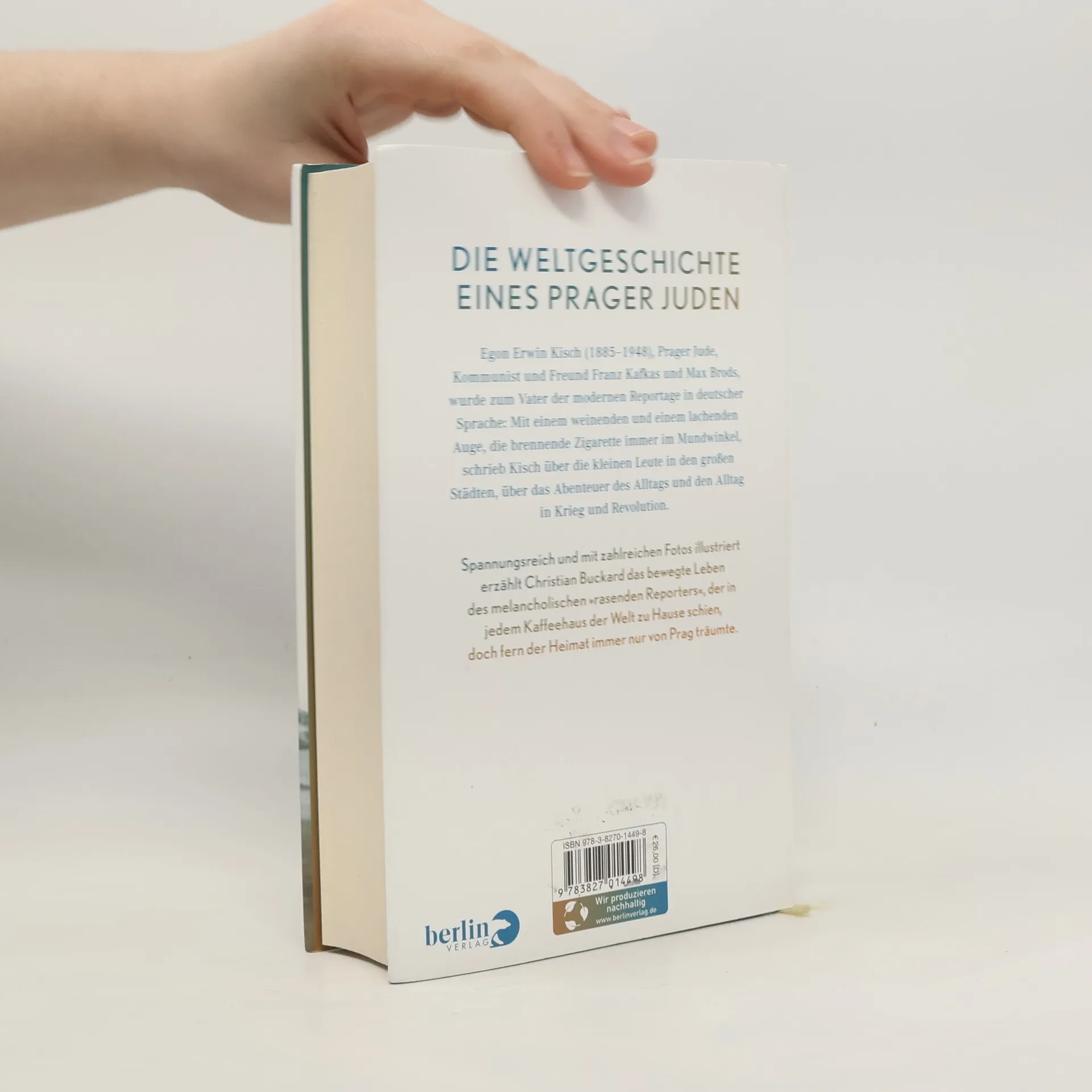 Die Weltgeschichte eines Prager Juden Egon Erwin Kisch (1885–1948), Prager Jude, Kommunist und Freund Franz Kafkas und Max Brods, wurde zum Vater der modernen Reportage in deutscher Sprache: Mit einem weinenden und einem lachenden Auge, die brennende Zigarette immer im Mundwinkel, schrieb Kisch über die kleinen Leute in den großen Städten, über das Abenteuer des Alltags und den Alltag in Krieg und Revolution. Das Leben des »rasenden Reporters« aus neuer Perspektive Spannungsreich und mit zahlreichen Fotos illustriert erzählt Christian Buckard das bewegte Leben des melancholischen »rasenden Reporters«, der in jedem Kaffeehaus der Welt zu Hause schien, doch fern der Heimat immer nur von Prag träumte. Zum 75. Todestag des Pioniers der modernen Reportage am 31. März 2023 Stimmen über Egon Erwin Kisch »Ich habe seine Reportagen verschlungen, die meisten auswendig gelernt. Für mich war Egon Erwin Kisch der 'Thomas Mann der Reportage'.« Billy Wilder »Sie sind mit dem Öl des wirklichen Erzählers gesalbt.« Alfred Döblin »Meiner Meinung nach kann man sich mit einem Fünftel Ihres Talents einen Nobelpreis zusammenschmieren, sofern man nichts von Ihrer Gesinnung mitbekommen hat.« Bertolt Brecht