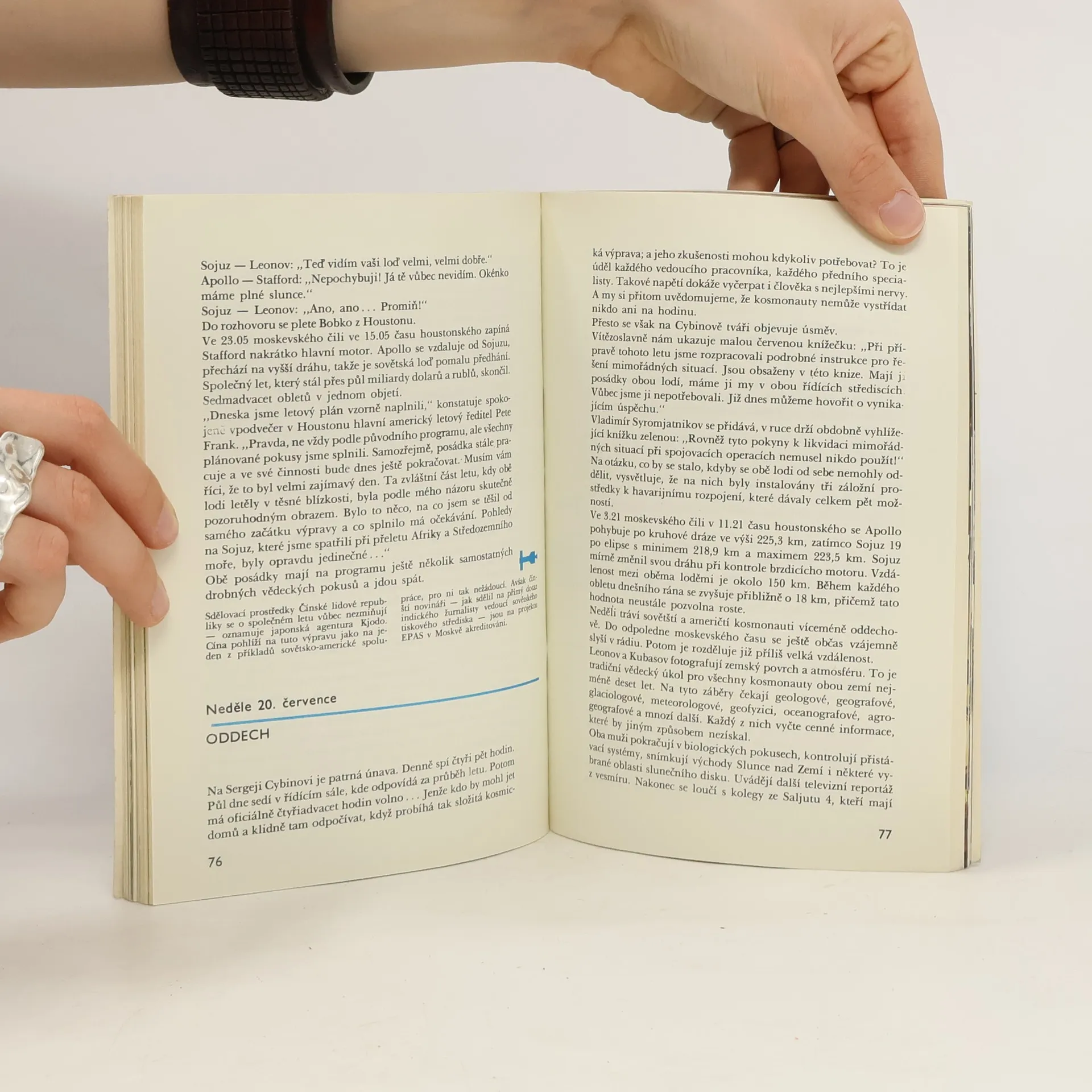 Reportážní formou popsaná významná událost v oblasti kosmonautiky - společný let sovětské i americké kosmické lodi do vesmíru.