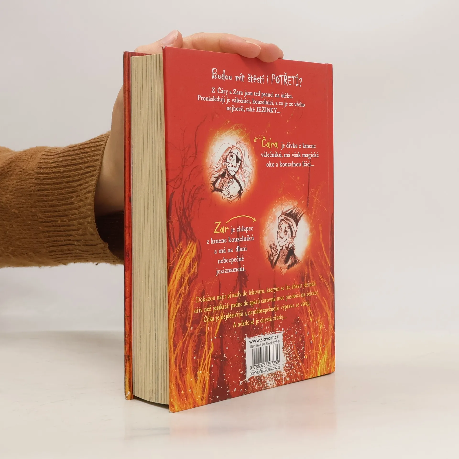 Z Čáry a Zara jsou teď psanci na útěku. Pronásledují je válečníci, kouzelníci, a co je ze všeho nejhorší, také jezinky... Budou mít štěstí i potřetí? Čára je dívka z kmene válečníků, má však magické oko a kouzelnou lžíci. Zar je chlapec z kmene kouzelníků a má na dlani nebezpečné jeziznamení. Dokážou najít přísady do lektvaru, kterým se lze zbavit jezinek, dřív než jezikráli padne do spárů čarovná moc působící na železo? Čeká je nejděsivější a nejnebezpečnější výprava ze všech. Hvozd zachvátil strašlivý požár a někdo se je chystá zradit... Třetí díl nové série od autorky knihy Jak vycvičit draka vás znovu zavede do dávných dob, kdy byl svět ještě plný kouzel, obrů, skřítků a huňatých sněžných rysů. Do časů létajících dveří a mluvících ptáků, jezinčích úšklebků a lítých vlkodlaků...