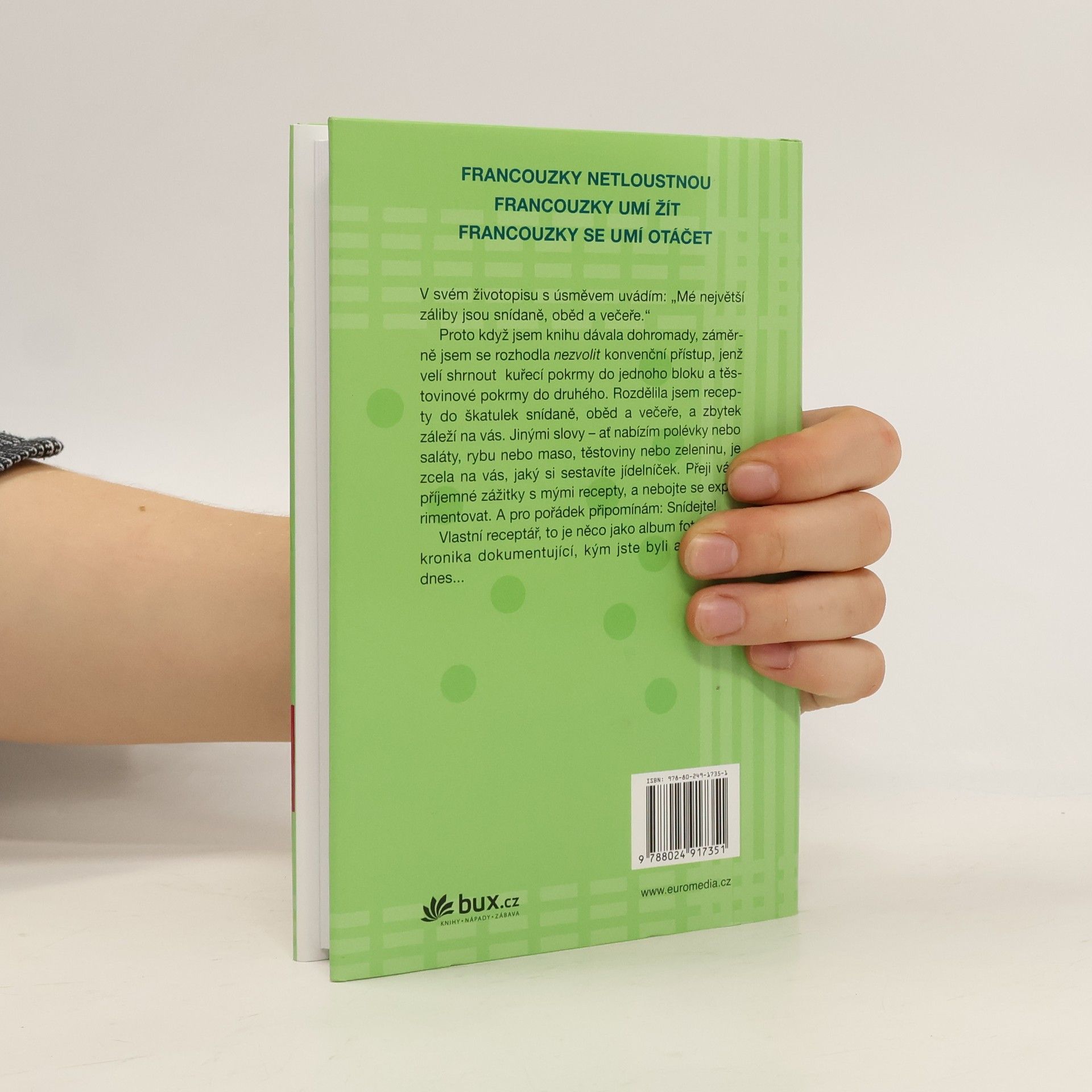 Knihy francouzské podnikatelky žijící ve Spojených státech Francouzky netloustnou a její dvě pokračování se staly bezesporu bestsellery. Mireille jednoho dne odjela jako mladá štíhlá studentka do Spojených států a po několika semestrech se vrátila do Francie s nadváhou. Díky rodinnému lékaři se jí brzy podařilo vrátit k původnímu stylu života - a také vzhledu. Autorka na vlastní zkušenosti odkryla tajemství francouzského paradoxu, který spočívá v tom, že právě Francouzky, jež jsou známé svým požitkářstvím, zůstávají až do vysokého věku štíhlé a vitální. Čtenářky nenechaly Mireille v klidu. Dychtily vědět, jak se opravdu stravuje, jak jídla připravuje a jaká jsou její dietní tajemství. Proto Mireille sestavila kuchařskou knihu - netradiční, zajímavou a inspirující. Předkládá vlastní interpretaci pokrmů, na nichž si léta pochutnávala s rodinou a přáteli, a také zbrusu nové „objevy“. Zařadila sem i malou kolekci osvědčených stálic a několik čtenáři vychválených receptů, které zazářily v předchozích knihách. Autorka věří v jednoduché recepty zachovávající ryzí chutě. Má ráda rozmanitost, jíž dociluje nakupováním čerstvého zboží na trhu. Zvlášť miluje pokrmy přinášející smyslový požitek, promlouvající ke zraku, čichu, chuti i hmatu. Z receptů se musí zrodit jídlo, které dobře chutná. Vše se točí kolem potěšení a zdraví. Uvidíte sami.