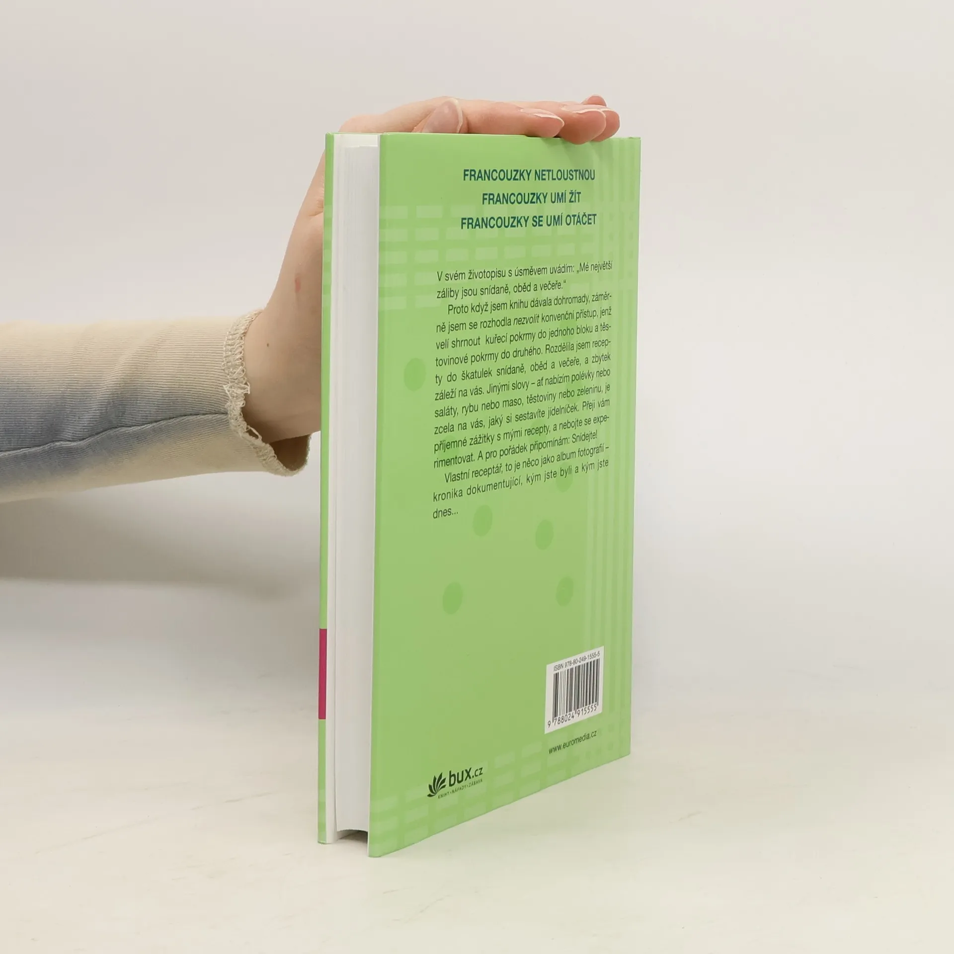 Knihy francouzské podnikatelky žijící ve Spojených státech Francouzky netloustnou a její dvě pokračování se staly bezesporu bestsellery. Mireille jednoho dne odjela jako mladá štíhlá studentka do Spojených států a po několika semestrech se vrátila do Francie s nadváhou. Díky rodinnému lékaři se jí brzy podařilo vrátit k původnímu stylu života - a také vzhledu. Autorka na vlastní zkušenosti odkryla tajemství francouzského paradoxu, který spočívá v tom, že právě Francouzky, jež jsou známé svým požitkářstvím, zůstávají až do vysokého věku štíhlé a vitální. Čtenářky nenechaly Mireille v klidu. Dychtily vědět, jak se opravdu stravuje, jak jídla připravuje a jaká jsou její dietní tajemství. Proto Mireille sestavila kuchařskou knihu - netradiční, zajímavou a inspirující. Předkládá vlastní interpretaci pokrmů, na nichž si léta pochutnávala s rodinou a přáteli, a také zbrusu nové „objevy“. Zařadila sem i malou kolekci osvědčených stálic a několik čtenáři vychválených receptů, které zazářily v předchozích knihách. Autorka věří v jednoduché recepty zachovávající ryzí chutě. Má ráda rozmanitost, jíž dociluje nakupováním čerstvého zboží na trhu. Zvlášť miluje pokrmy přinášející smyslový požitek, promlouvající ke zraku, čichu, chuti i hmatu. Z receptů se musí zrodit jídlo, které dobře chutná. Vše se točí kolem potěšení a zdraví. Uvidíte sami.