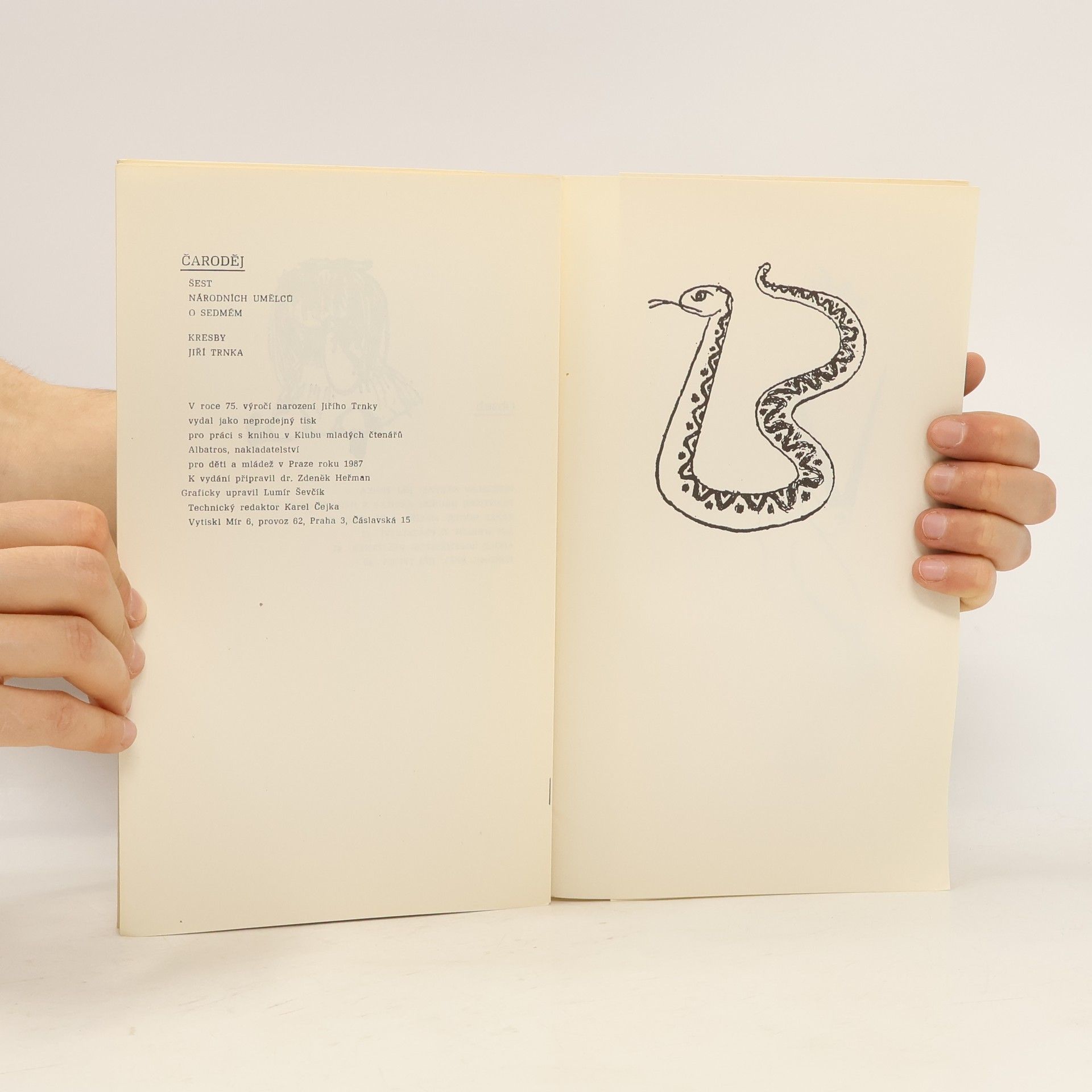Šest národních umělců (V. Nezval, F. Hrubín, K. Hoger, J. Werich, A. Hoffmeister a B. Říha) o sedmém. K 75. výročí narození Jiřího Trnky. Neprodejný tisk.