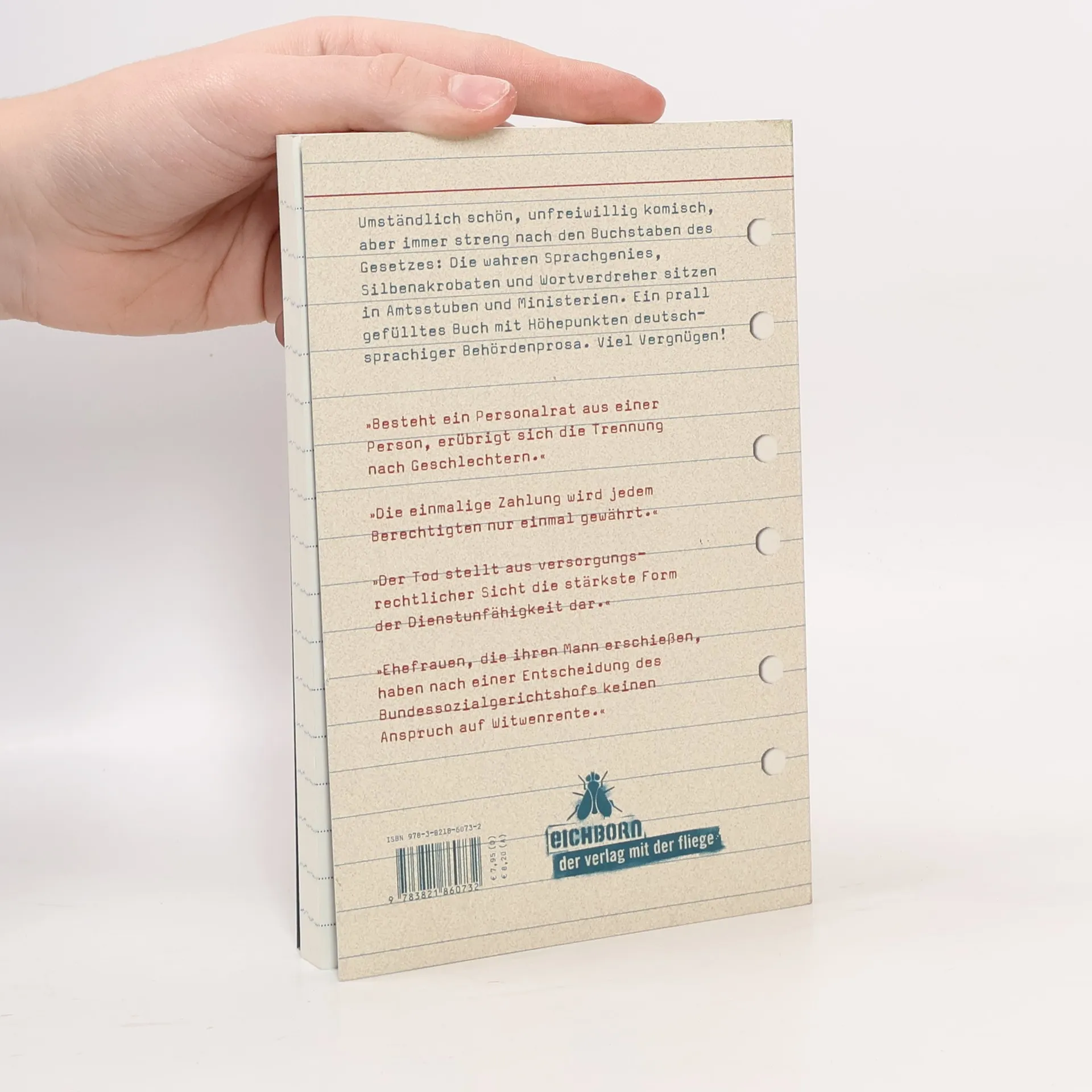 Umständlich schön, unfreiwillig komisch, aber immer streng nach dem Buchstaben des Gesetzes: Ein prall gefülltes Buch mit Höhepunkten der Behördenprosa. Wir haben es immer gewusst: Die wahren Sprachschöpfer sitzen in unseren Amtsstuben und in den Ministerien, die Gesetzestexte verfassen. Die Fülle der ambitionierten Wort- und Sprachspiele lässt manchen Lyriker und verdienten Prosaisten erblassen. Hier noch ein paar Kostproben: „Die einmalige Zahlung wird jedem Berechtigten nur einmal gewährt.“ „Der Tod stellt aus versorgungsrechtlicher Sicht die stärkste Form der Dienstunfähigkeit dar.“ „Ehefrauen, die ihren Mann erschießen, haben nach einer Entscheidung des Bundessozialgerichtshofs keinen Anspruch auf Witwenrente.“