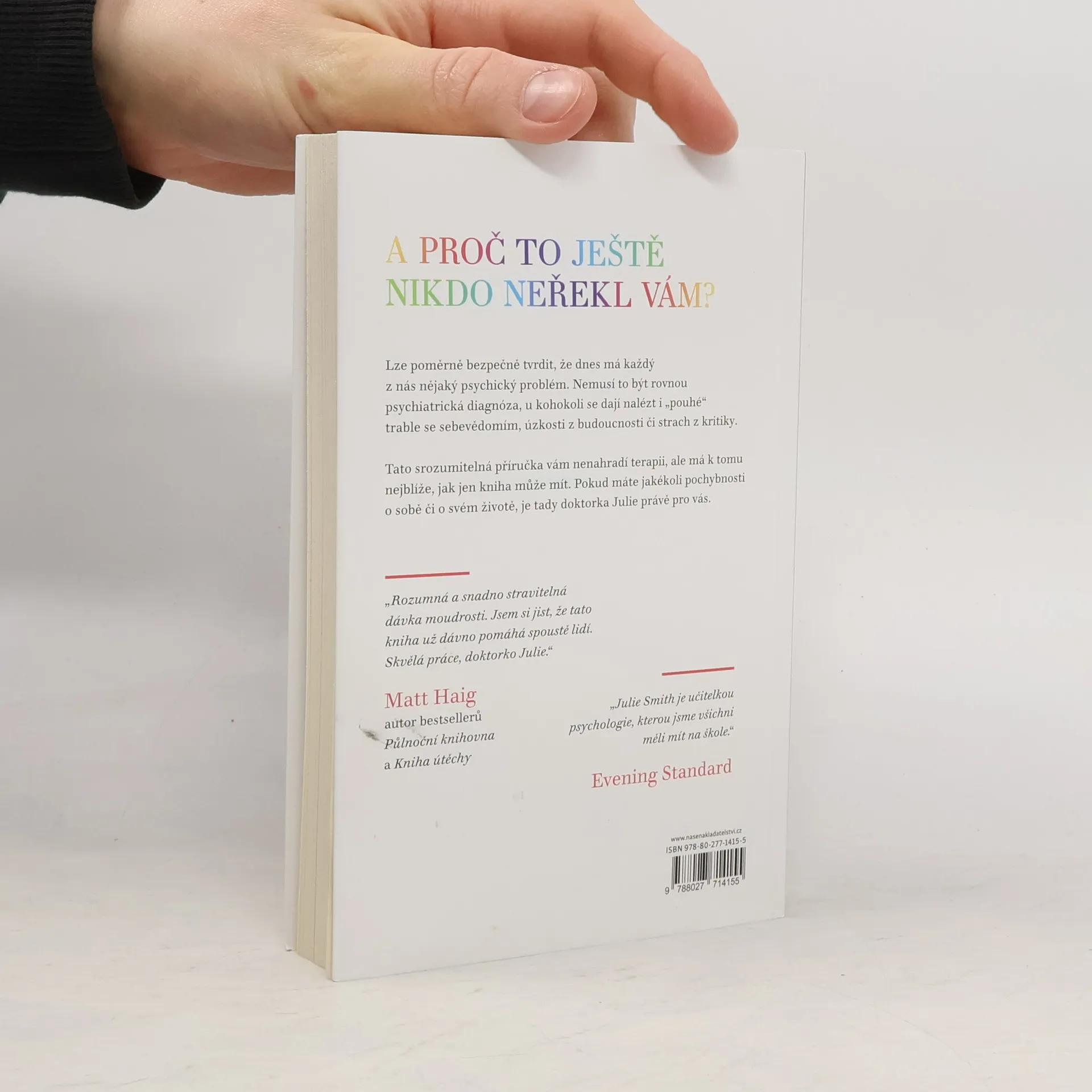 Kniha Proč mi tohle nikdo neřekl dřív? vás naučí, jak posílit své psychické zdraví a udržet si ho i v těch nejnáročnějších obdobích. Odborné rady doktorky Julie Smith a účinné copingové techniky vám pomohou zachovat vaši odolnost, ať už se chcete vyrovnat s úzkostmi, s kritikou, s depresí, vybudovat si sebejistotu, nalézt motivaci nebo se naučit odpouštět sami sobě.Na základě dlouholetých zkušeností s klinickou psychologií se autorka dělí o všechny dovednosti, které potřebujete, abyste zvládli životní vzestupy a pády.Tato kniha je plná tajemství z terapeutovy sady nástrojů a je nezbytnou příručkou pro optimalizaci duševního zdraví. Jednoduché, ale odborné rady doktorky Julie a účinné techniky zvládání vám pomohou zůstat odolní bez ohledu na to, co vám život postaví do cesty.Kniha je napsána v krátkých heslech, takže můžete přejít rovnou na tu část, kterou potřebujete, podle toho, jakému problému právě čelíte – a okamžitě najít vhodné nástroje, které vám pomohou.