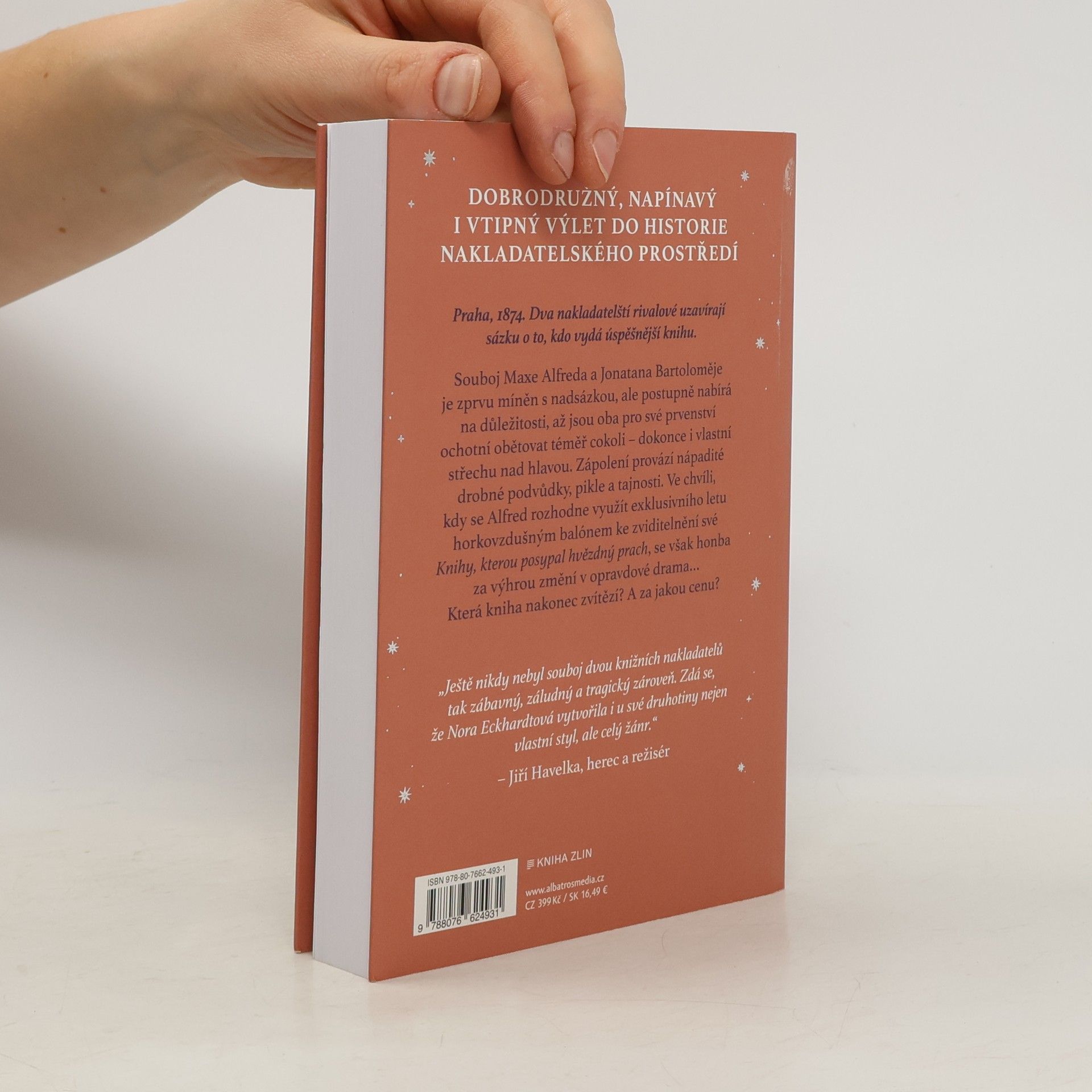 Dobrodružný, napínavý i vtipný výlet do historie nakladatelského prostředí.Praha, 1874. Dva nakladatelští rivalové uzavírají sázku o to, kdo vydá úspěšnější knihu. Souboj Maxe Alfreda a Jonatana Bartoloměje je zprvu míněn s nadsázkou, ale postupně nabírá na důležitosti, až jsou oba pro své prvenství ochotní obětovat téměř cokoli – i střechu nad hlavou. Zápolení provází drobné podvůdky, pikle a tajnosti. Ve chvíli, kdy se Alfred rozhodne využít exklusivního letu balónem ke zviditelnění své „Knihy, kterou posypal hvězdný prach“, se však honba za výhrou mění v opravdové drama…