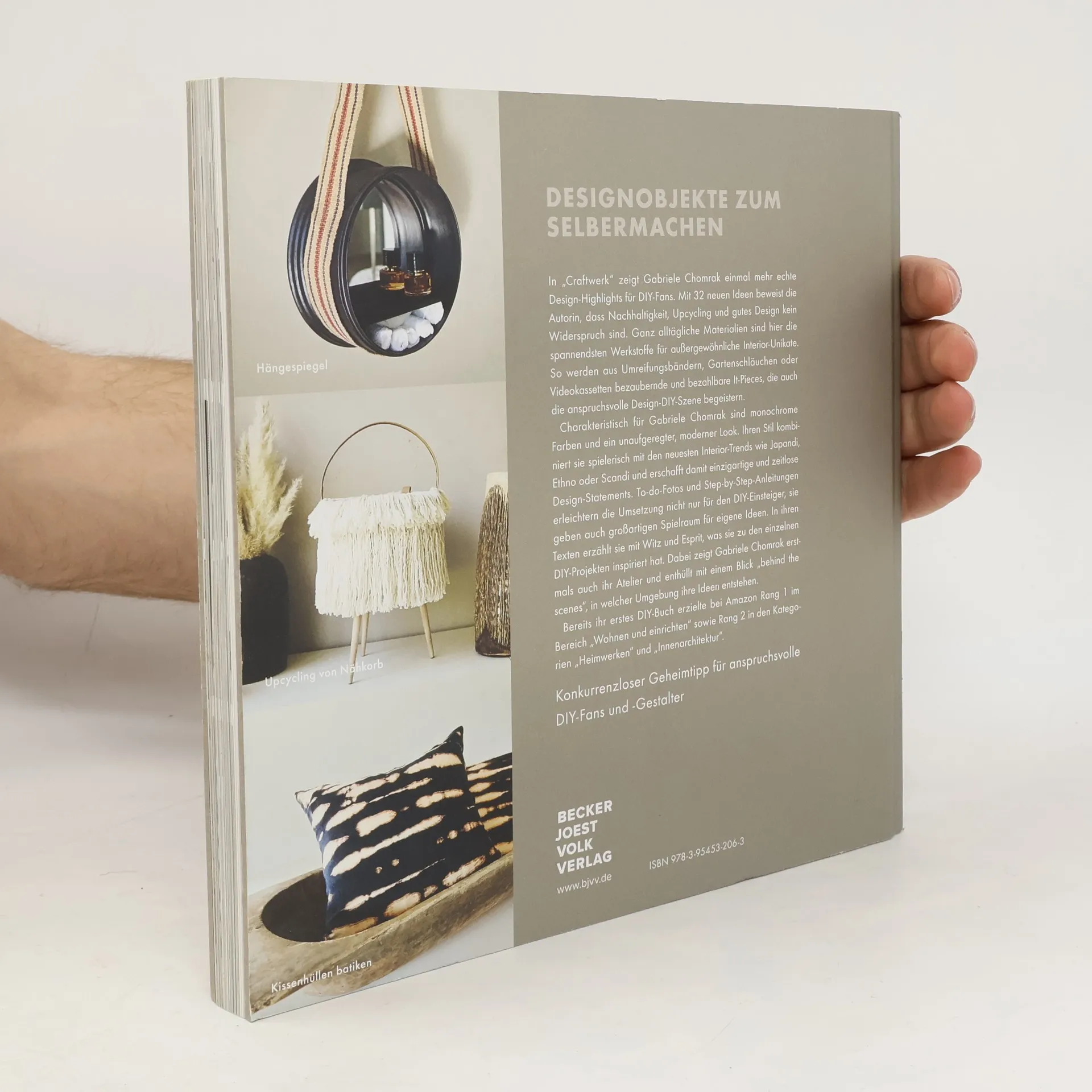 Designobjekte zum Selbermachen In „Craftwerk“ zeigt Gabriele Chomrak einmal mehr echte Design-Highlights für DIY-Fans. Mit 32 neuen Ideen beweist die Autorin, dass Nachhaltigkeit, Upcycling und gutes Design kein Widerspruch sind. Ganz alltägliche Materialien sind hier die spannendsten Werkstoffe für außergewöhnliche Interior-Unikate. So werden aus Umreifungsbändern, Gartenschläuchen oder Videokassetten bezaubernde und bezahlbare It-Pieces, die auch die anspruchsvolle Design-DIY-Szene begeistern. Charakteristisch für Gabriele Chomrak sind monochrome Farben und ein unaufgeregter, moderner Look. Ihren Stil kombiniert sie spielerisch mit den neuesten Interior-Trends wie Japandi, Ethno oder Scandi und erschafft damit einzigartige und zeitlose Design-Statements. To-do-Fotos und Step-by-Step-Anleitungen erleichtern die Umsetzung nicht nur für den DIY-Einsteiger, sie geben auch großartigen Spielraum für eigene Ideen. In ihren Texten erzählt sie mit Witz und Esprit, was sie zu den einzelnen DIY-Projekten inspiriert hat. Dabei zeigt Gabriele Chomrak erstmals auch ihr Atelier und enthüllt mit einem Blick „behind the scenes“, in welcher Umgebung ihre Ideen entstehen. Bereits ihr erstes DIY-Buch erzielte bei Amazon Rang 1 im Bereich „Wohnen und einrichten“ sowie Rang 2 in den Kategorien „Heimwerken“ und „Innenarchitektur“. Konkurrenzloser Geheimtipp für anspruchsvolle DIY-Fans und -Gestalter