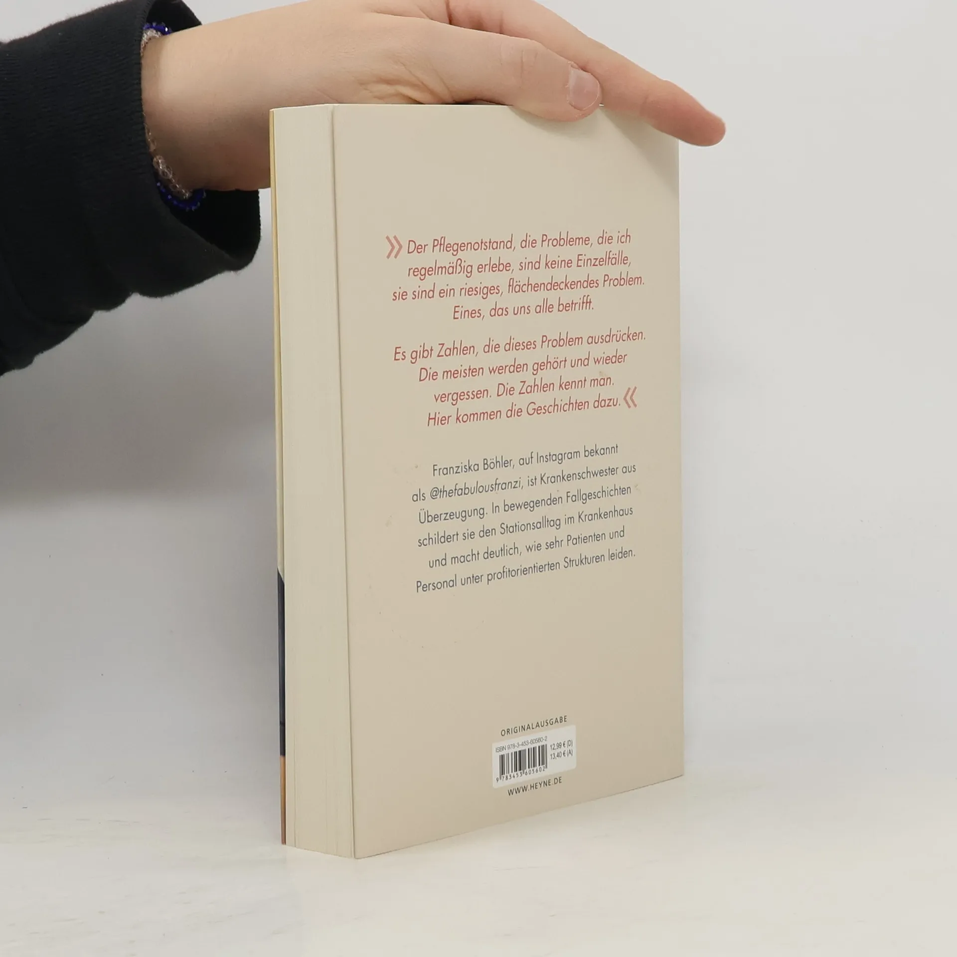 Franziska Böhler, Krankenschwester aus Überzeugung, schildert in bewegenden Fallgeschichten den Stationsalltag im Krankenhaus und macht deutlich, wie sehr Patienten und Personal unter profitorientierten Strukturen leiden.Sie hat sich für Nachtdienste und Wochenendschichten entschieden, für viel Arbeit und noch mehr Verantwortung, für einen Job, der sie fordert – ihr Herz und ihren Verstand. Nicht entschieden hat sie sich für Dienste in ständiger Unterbesetzung, für Bedingungen, die Pflege und Medizin gefährlich und unmenschlich machen. Und doch finden sich Pflegekräfte immer öfter in dieser Situation: Sie arbeiten in einem Gesundheitssystem, das längst selbst dringend Hilfe braucht.In ergreifenden Fallgeschichten aus ihrem Arbeitsalltag, aber auch von Patienten, Hebammen, Auszubildenden und Ärzten macht Franziska Böhler deutlich, wieviel Leid der Kostendruck und der Personalmangel in Krankenhäusern und Altenheimen verursachen. Die Zahlen zum Pflegenotstand hat vermutlich jeder schon mal gehört. Franziska Böhler schildert die Geschichten dahinter. Dabei vergisst sie auch die guten Momente nicht. Momente, die es wert sind, sich trotz allem genau für diesen Beruf immer wieder zu entscheiden. Ausgezeichnet mit dem LovelyBooks Leserpreis 2020 in Silver.