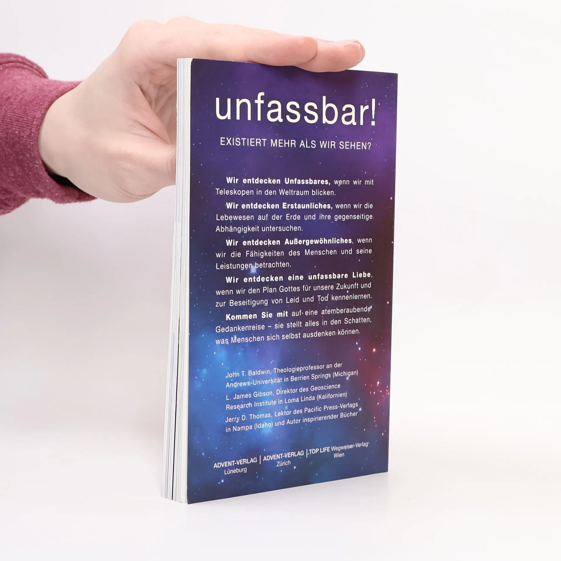 Wir entdecken Unfassbares, wenn wir mit Teleskopen in den Weltraum blicken. Wir entdecken Erstaunliches, wenn wir die Lebewesen auf der Erde und ihre gegenseitige Abhängigkeit untersuchen. Wir entdecken Außergewöhnliches, wenn wir die Fähigkeiten des Menschen und seine Leistungen betrachten. Wir entdecken eine unfassbare Liebe, wenn wir den Plan Gottes für unsere Zukunft und zur Beseitigung von Leid und Tod kennenlernen. Kommen Sie mit auf eine atemberaubende Gedankenreise – sie stellt alles in den Schatten, was Menschen sich selbst ausdenken können.
