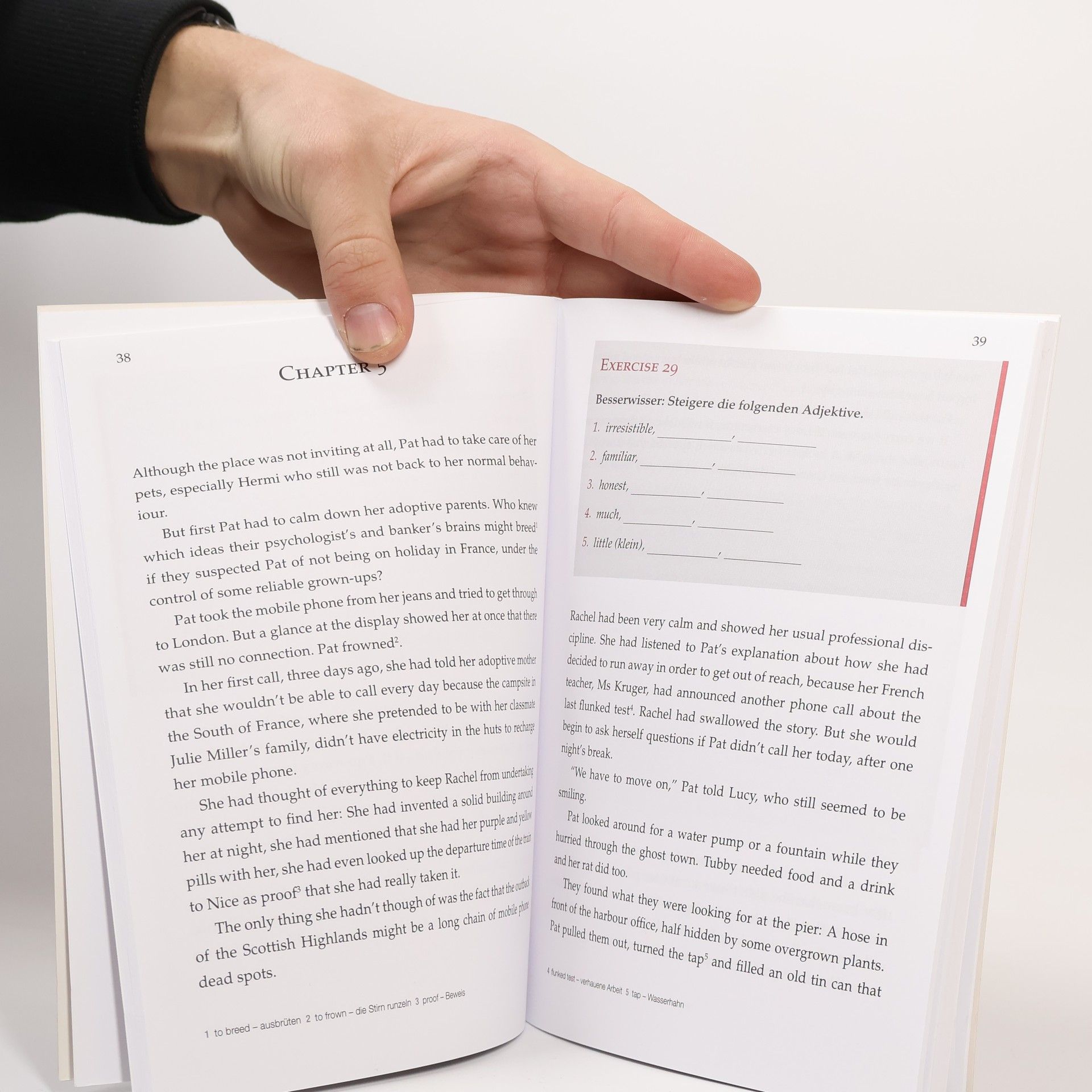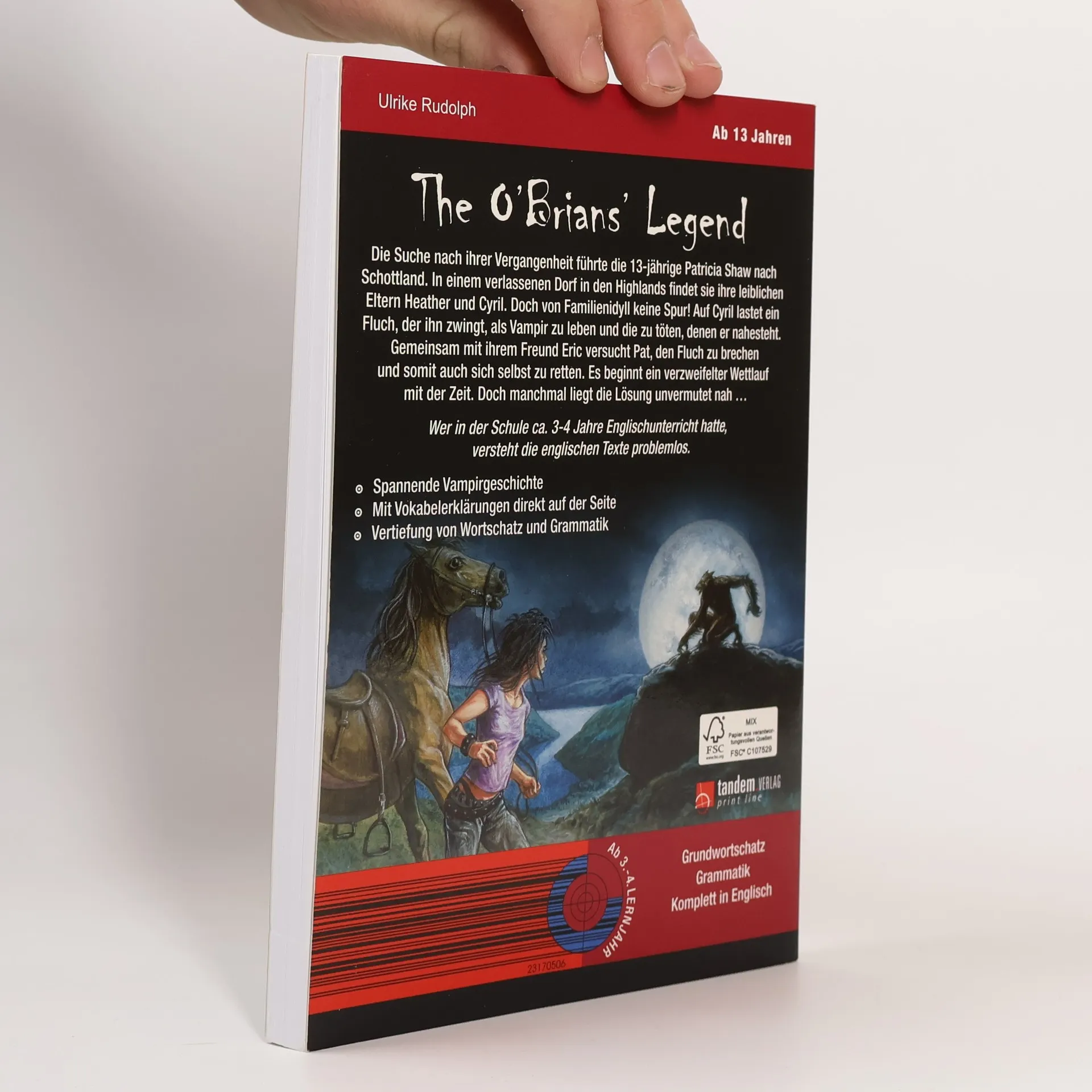 YOUNG VAMPIRES’ LANGUAGE SCHOOL: The O'Brians' Legend Diese Reihe englischsprachiger Vampirgeschichten bietet spannende Storys und intensives Englisch-Training zugleich. Im Laufe der Handlung sind zahlreiche Lernübungen eingestreut, die man zwischendurch bearbeiten kann. Auf diese Weise wird das Gelesene vertieft und der Lernfortschritt überprüft. Inhalt: Die Suche nach ihrer Vergangenheit führte die 13-jährige Patricia Shaw nach Schottland. In einem verlassenen Dorf in den Highlands findet sie ihre leiblichen Eltern Heather und Cyril. Doch von Familienidyll keine Spur! Auf Cyril lastet ein Fluch, der ihn zwingt, als Vampir zu leben und die zu töten, denen er nahesteht. Gemeinsam mit ihrem Freund Eric versucht Pat, den Flcuh zu brechen und somit auch sich selbst zu retten. Es beginnt ein verzweifelter Wettlauf mit der Zeit. Doch manchmal liegt die Lösung unvermutet nah. Schwierige Vokabeln werden am Seitenende übersetzt. Ein Abschlussquiz stellt Fragen zur Handlung. Hier kann man im Selbsttest prüfen, ob man die Handlung verstanden hat. Fremdsprachenkenntnisse auf unterhaltsame Weise verbessern, nach dem Motto: Spannende Geschichten lesen – entspannt Englisch lernen
