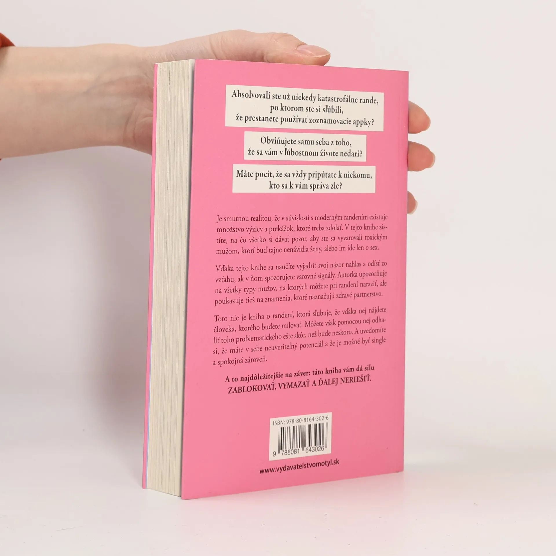 Príručka, ako randiť a vyhnúť sa toxickým mužom.Absolvovali ste už niekedy katastrofálne rande, po ktorom ste si sľúbili, že prestanete používať zoznamovacie appky? Obviňujete samu seba z toho, že sa vám v ľúbostnom živote nedarí? Máte pocit, že sa vždy pripútate k niekomu, kto sa k vám správa zle?Je smutnou realitou, že v súvislosti s moderným randením existuje množstvo výziev a prekážok, ktoré treba zdolať. V tejto knihe zistíte, na čo všetko si dávať pozor, aby ste sa vyvarovali toxickým mužom, ktorí buď tajne nenávidia ženy, alebo im ide len o sex. Vďaka tejto knihe sa naučíte vyjadriť svoj názor nahlas a odísť zo vzťahu, ak v ňom spozorujete varovné signály. Autorka upozorňuje na všetky typy mužov, na ktorých môžete pri randení naraziť, ale poukazuje tiež na znamenia, ktoré naznačujú zdravé partnerstvo. Toto nie je kniha o randení, ktorá sľubuje, že vďaka nej nájdete človeka, ktorého budete milovať. Môžete však pomocou nej odhaliť toho problematického ešte skôr, než bude neskoro. A uvedomíte si, že máte v sebe neuveriteľný potenciál a že je možné byť single a spokojná zároveň.A to najdôležitejšie na záver: táto kniha vám dá silu ZABLOKOVAŤ, VYMAZAŤ A ĎALEJ NERIEŠIŤ.Randili ste s mužmi za posledných päť rokov, odkedy začali byť populárne zoznamovacie appky? Ak áno, asi presne viete, o čom hovorím, a ak nie, potom ste mali obrovské šťastie.Nemáte len jednu šancu byť skvelá, než sa vám skončí záruka. Nie ste potravina.
