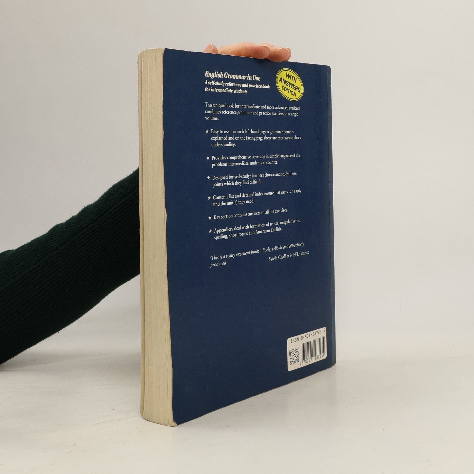 English Grammar in Use is a unique combination of reference grammar and practice book for intermediate students (including both lower and upper-intermediate). Designed as a self-study book, it will enable learners to select and study at their own speed those grammar points which they find confusing and want to clarify. All the traditional grammar problems which intermediate students encounter e.g. tenses, modals, prepositions etc., are thoroughly covered. The page layout of each unit makes for ease of use, with the grammar point explained on the left-hand page and exercises to practise it on the right-hand page. There are 130 units in all, and a contents list and detailed index ensure that students can easily find the units they need.