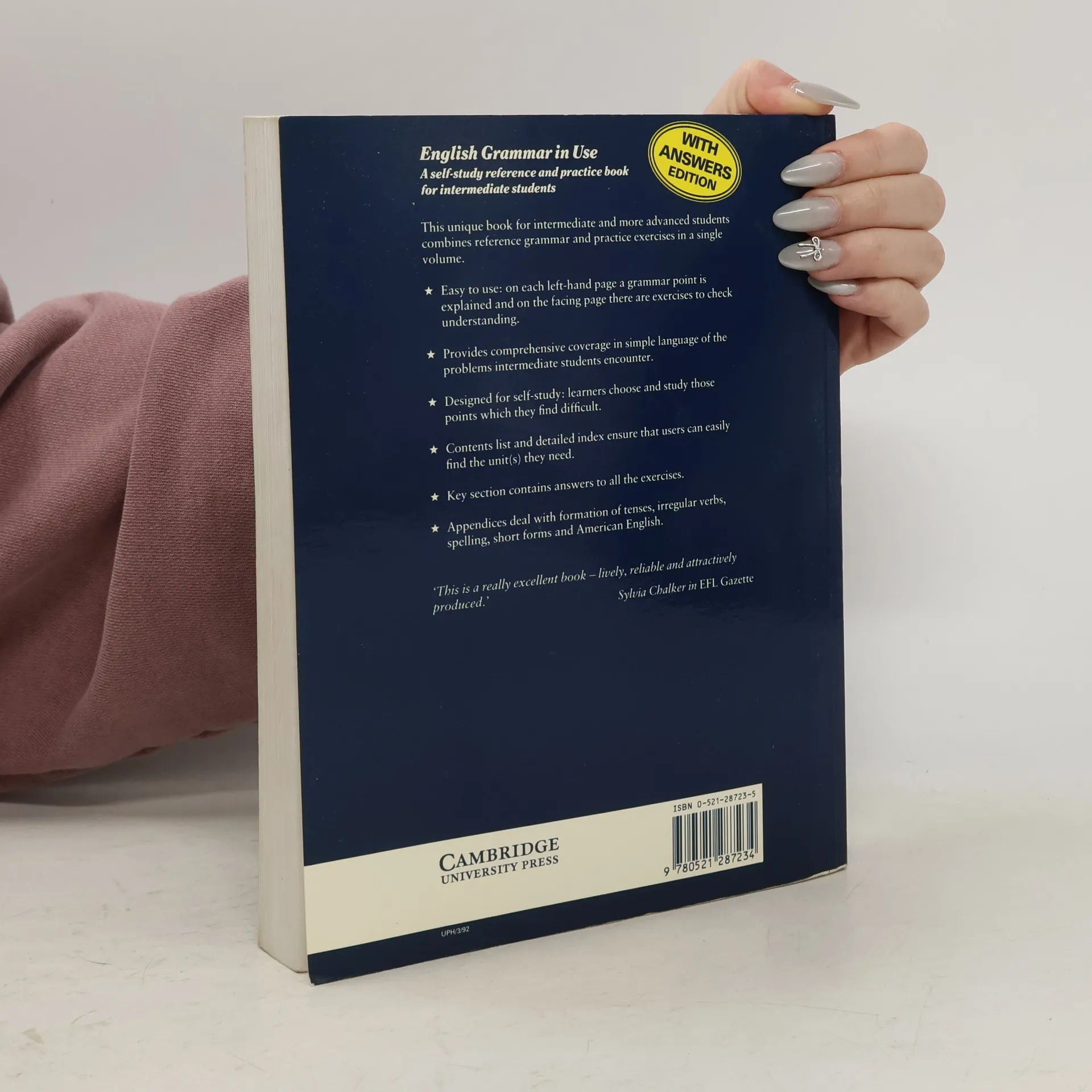 English Grammar in Use is a unique combination of reference grammar and practice book for intermediate students (including both lower and upper-intermediate). Designed as a self-study book, it will enable learners to select and study at their own speed those grammar points which they find confusing and want to clarify. All the traditional grammar problems which intermediate students encounter e.g. tenses, modals, prepositions etc., are thoroughly covered. The page layout of each unit makes for ease of use, with the grammar point explained on the left-hand page and exercises to practise it on the right-hand page. There are 130 units in all, and a contents list and detailed index ensure that students can easily find the units they need.
