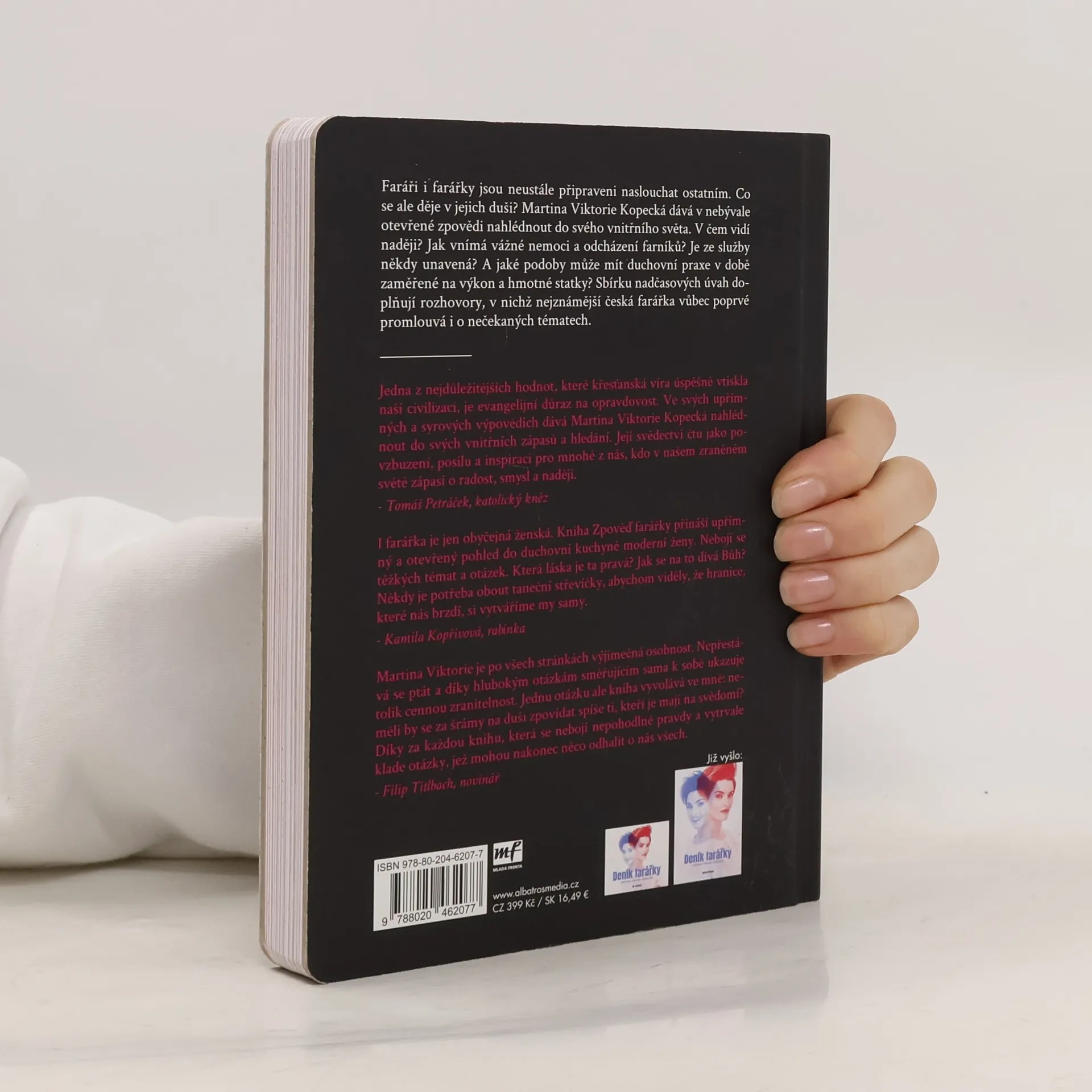 O životě farářky už jste četli. Teď se připravte na cestu do jejího nitra. Faráři i farářky jsou neustále připraveni naslouchat ostatním. Co se ale děje v jejich duši? Martina Viktorie Kopecká dává v nebývale otevřené zpovědi nahlédnout do svého vnitřního světa. Co si myslí o celibátu a založení rodiny? Jak vnímá vážné nemoci a odcházení svých farníků? Je ze služby někdy unavená? A jaké podoby může mít duchovní praxe v době zaměřené na výkon a hmotné statky? Sbírku nadčasových úvah doplňují rozhovory, v nichž nejznámější česká farářka vůbec poprvé promlouvá i o nečekaných tématech.