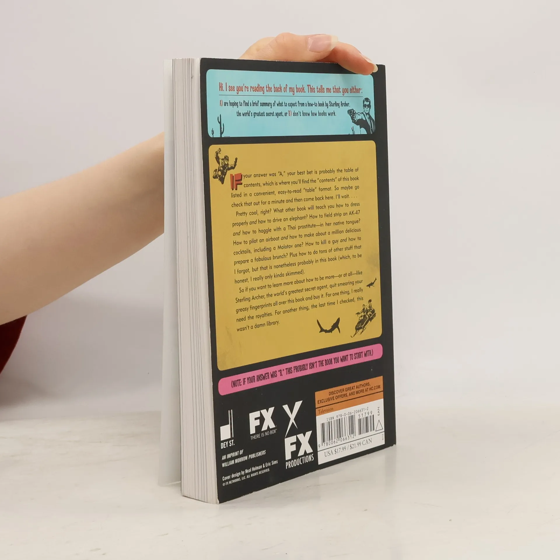 Hi. I see you’re reading the back of my book. This tells me that you either: A) are hoping to find a brief summary of what to expect from a how-to book by Sterling Archer, the world’s greatest secret agent, or B) don’t know how books work. If your answer was “A,” your best bet is probably the table of contents, which is where you’ll find the “contents” of this book listed in a convenient, easy-to-read “table” format. So maybe go check that out for a minute and then come back here. I’ll wait. . . . Pretty cool, right? What other book will teach you how to dress properly and how to drive an elephant? How to field strip an AK-47 and how to haggle with a Thai prostitute—in her native tongue? How to pilot an airboat and how to make about a million delicious cocktails, including a Molotov one? How to kill a guy and how to prepare a fabulous brunch? Plus how to do tons of other stuff that I forgot, but that is nonetheless probably in this book (which, to be honest, I really only kinda skimmed). So if you want to learn more about how to be more—or at all—like Sterling Archer, the world’s greatest secret agent, quit smearing your greasy fingerprints all over this book and buy it. For one thing, I really need the royalties. For another thing, the last time I checked, this wasn’t a damn library.