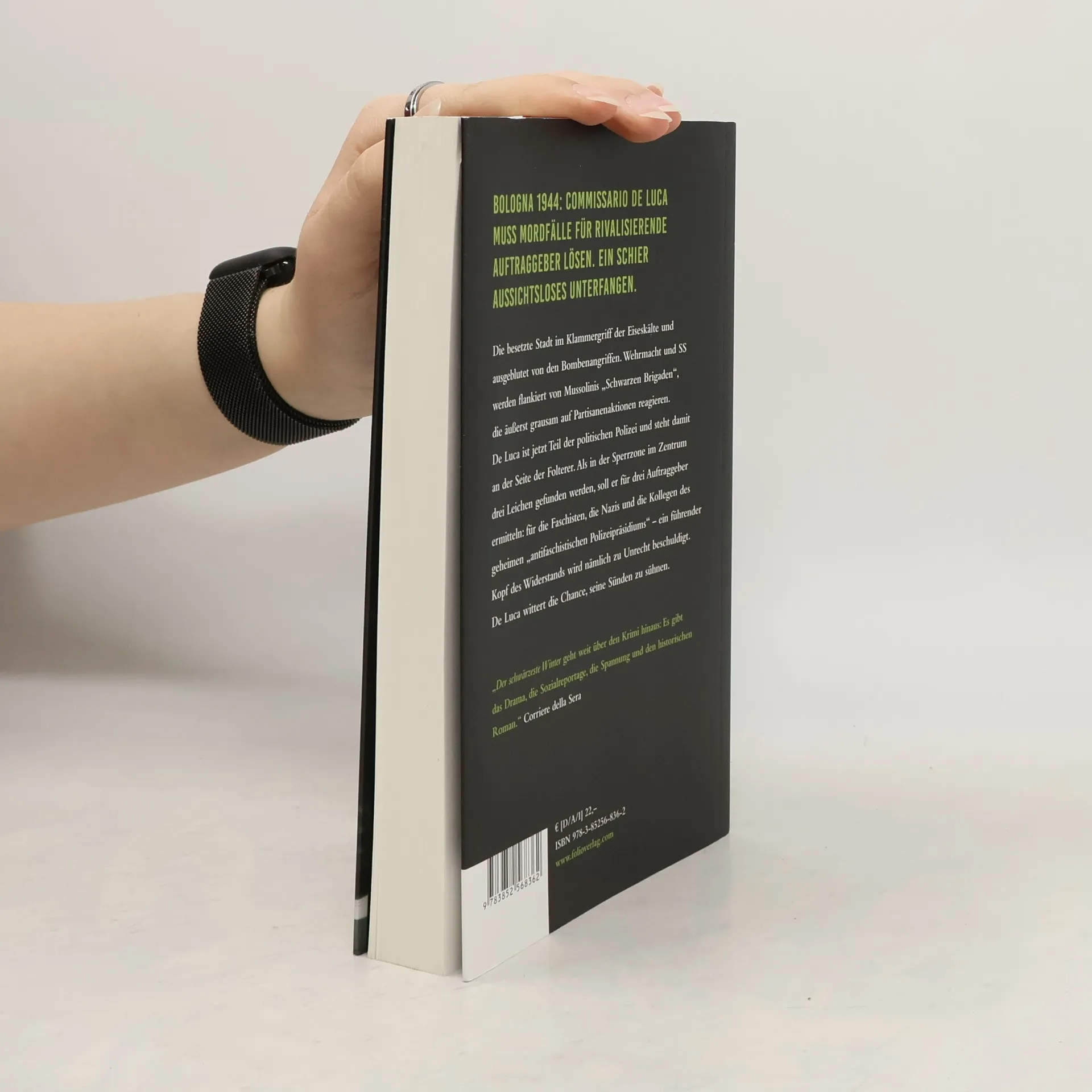 Bologna 1944: Commissario De Luca muss Mordfälle für rivalisierende Auftraggeber lösen. Ein schier aussichtsloses Unterfangen. Die besetzte Stadt im Klammergriff der Eiseskälte und ausgeblutet von den Bombenangriffen. Wehrmacht und SS werden flankiert von Mussolinis „Schwarzen Brigaden“, die äußerst grausam auf Partisanenaktionen reagieren. De Luca ist jetzt Teil der politischen Polizei und steht damit an der Seite der Folterer. Als in der Sperrzone im Zentrum drei Leichen gefunden werden, soll er für drei Auftraggeber ermitteln: für die Faschisten, die Nazis und die Kollegen des geheimen „antifaschistischen Polizeipräsidiums“ – ein führender Kopf des Widerstands wird nämlich zu Unrecht beschuldigt. De Luca wittert die Chance, seine Sünden zu sühnen.