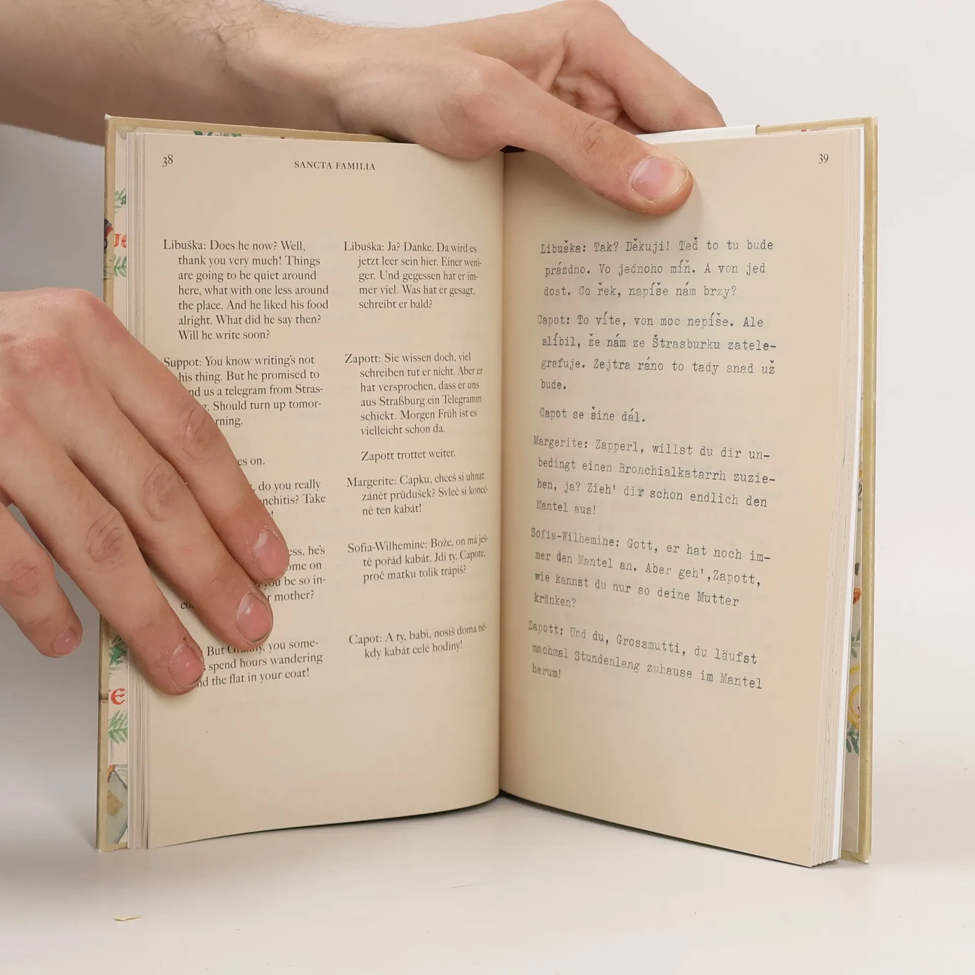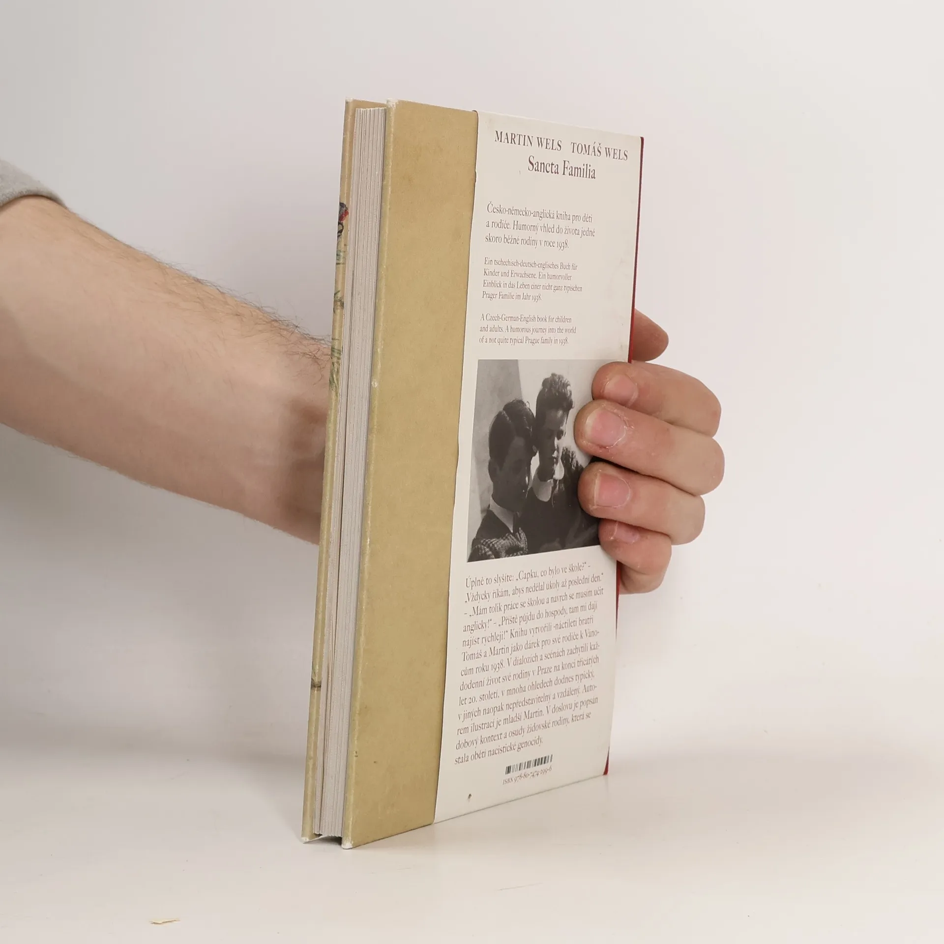 Knihu vytvořili bratři Tomáš a Martin Welsovi jako dárek pro rodiče k Vánocům 1938, zachycující každodenní život jejich rodiny v Praze na konci třicátých let 20. století. Sestává z dialogů a scén, které ilustrují rodinné vztahy a situace, typické i nepředstavitelné. Martin, mladší bratr, je autorem ilustrací. Texty se střídají v češtině, němčině, angličtině a francouzštině, což odráží jazykovou situaci v Praze a činí knihu přístupnou i pro jinojazyčné čtenáře. Název „Sancta Familia“ vystihuje rodinné vztahy, které se pohybují mezi láskyplným škádlením a vášnivými debatami. V knize se objevují běžné situace, jako procházka s matkou, rodinné diskuse u jídelního stolu a spekulace o přátelstvích a emigraci. Bratři v knize, vzniklé krátce po Mnichovské dohodě, předjímají budoucnost, kdy by Tomáš mohl odjet do Ameriky. I přes humor a vtipy se však projevují obavy o budoucnost. V říjnu 1938 rodina žádala o vízum do USA. Rudolf a Ida, narození do židovských rodin, měli úspěšného syna architekta, ale události se vyvinuly jinak. Tomáš unikl do Británie, zatímco Martin a rodiče byli zavražděni v Osvětimi v roce 1944. Tomáš se po válce vrátil do Prahy, ale už nikoho nenašel. Kniha, kterou si vzal do Anglie, zůstala neotevřená.